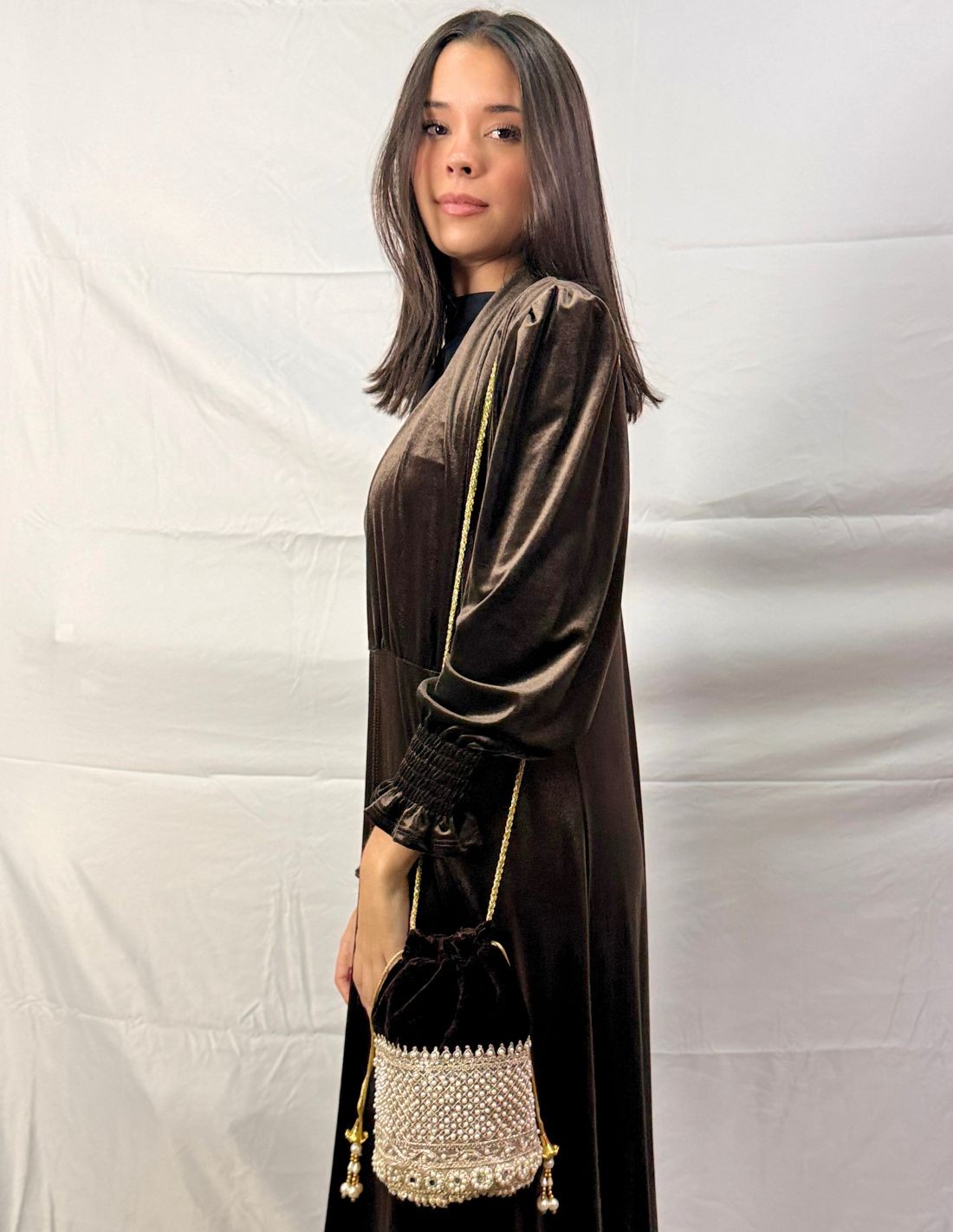 Completa tu look de invitada con un accesorio que marque la diferencia con pequeños detalles como esta bombonera confeccionada en terciopelo de color marrón con detalles incorporados de pequeñas perlas combinadas con apliques dorados, y con una cinta larga dorada para colgar. Podrás llevarla tanto colgada del hombro como bolso de mano con sus dos cintas más cortas. Un complemento ideal donde llevar tus esenciales a cualquier evento especial de la temporada.