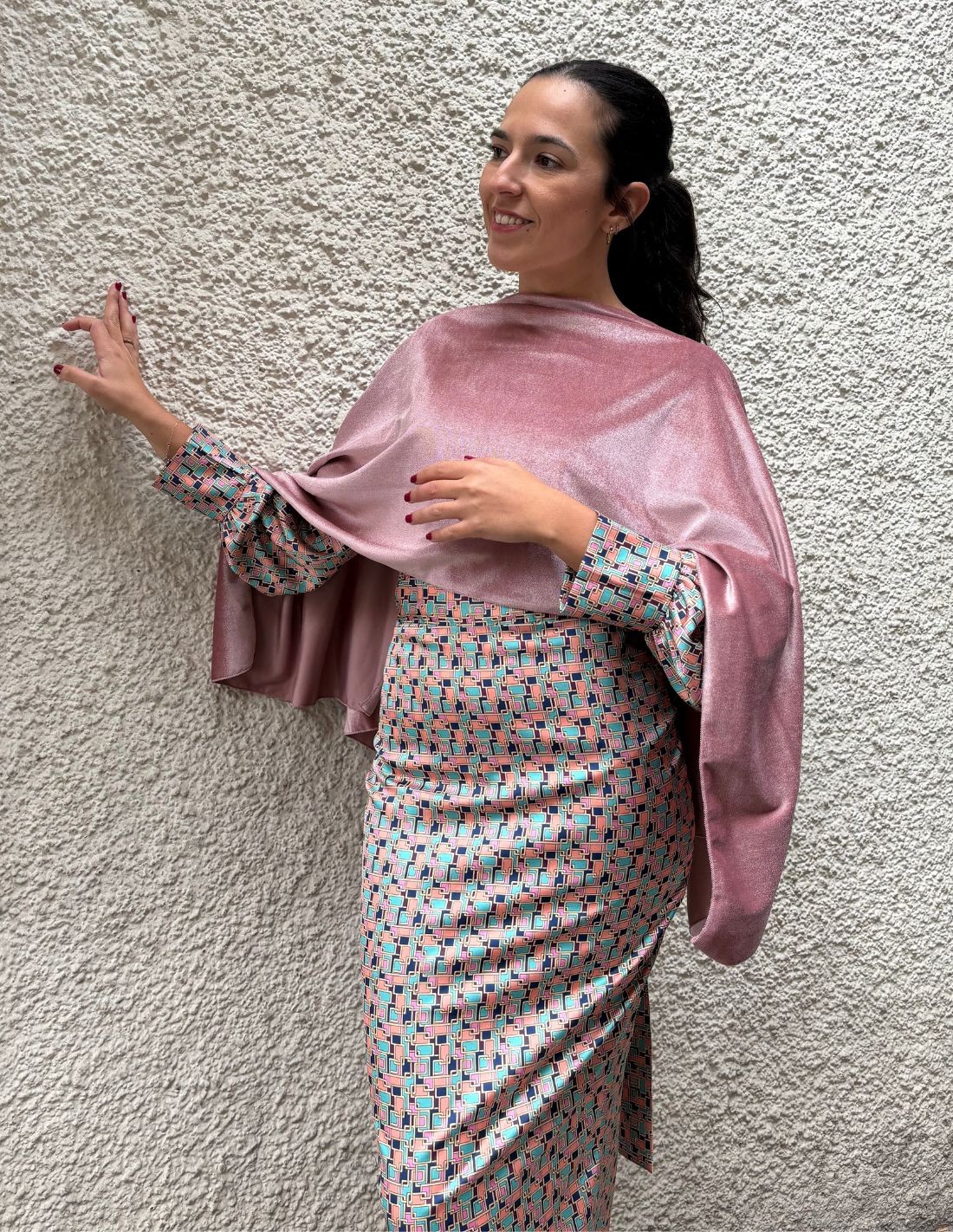 Capa corta de invitada en terciopelo color rosa con aberturas