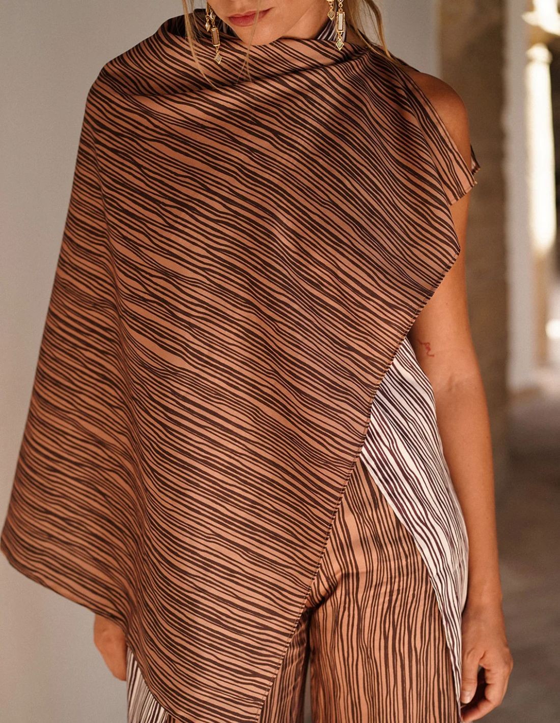 Si ya tienes tu look de invitada para tu próxima ocasión especial pero estás buscando cómo darle ese toque original y diferencial, esta capa cuadrada podría ser la opción ideal, o incluso si quieres completar el set de top y pantalón que combinan con la capa. Una prenda versátil con diseño cuadrado, en diferentes tonos de marrón con estampado de rayas uniformes.