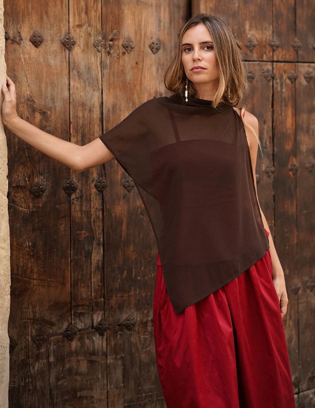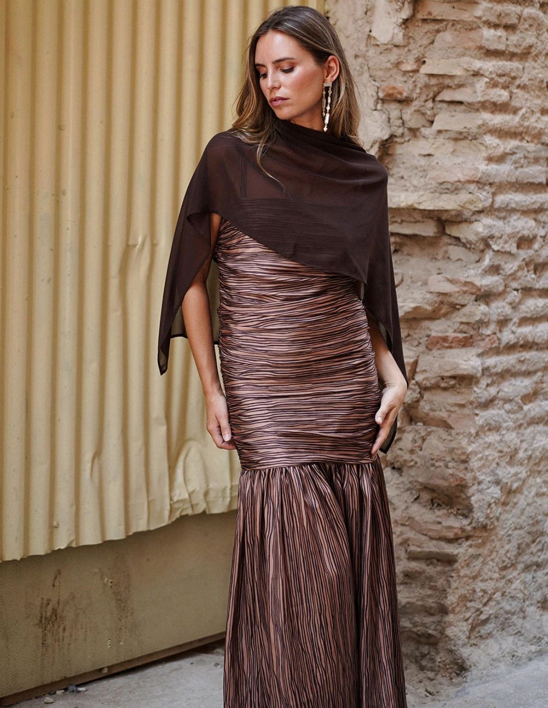 Completa tu look de invitada para tu próxima ocasión especial con el accesorio de la temporada y en el color de la temporada. Esta capa marrón de gasa es el complemento perfecto, una prenda versátil, sofisticada y ligera, con un diseño fluido con caída que aporta movimiento y elegancia al look, siendo el accesorio perfecto para vestidos de fiesta o conjuntos formales para esta temporada.