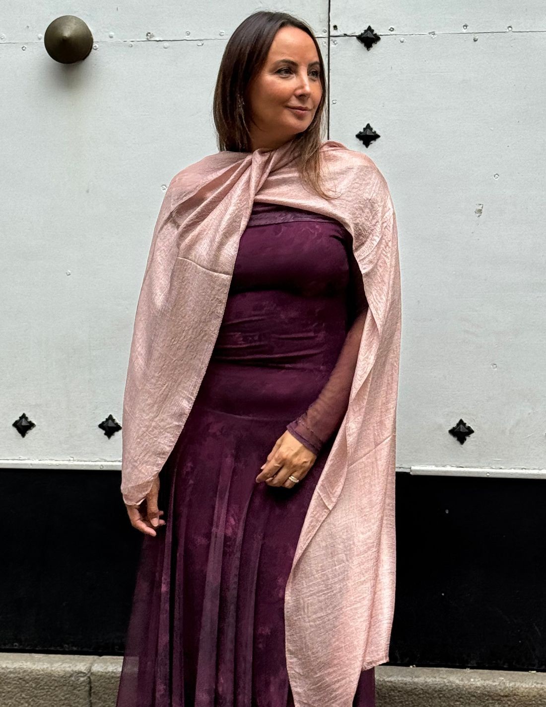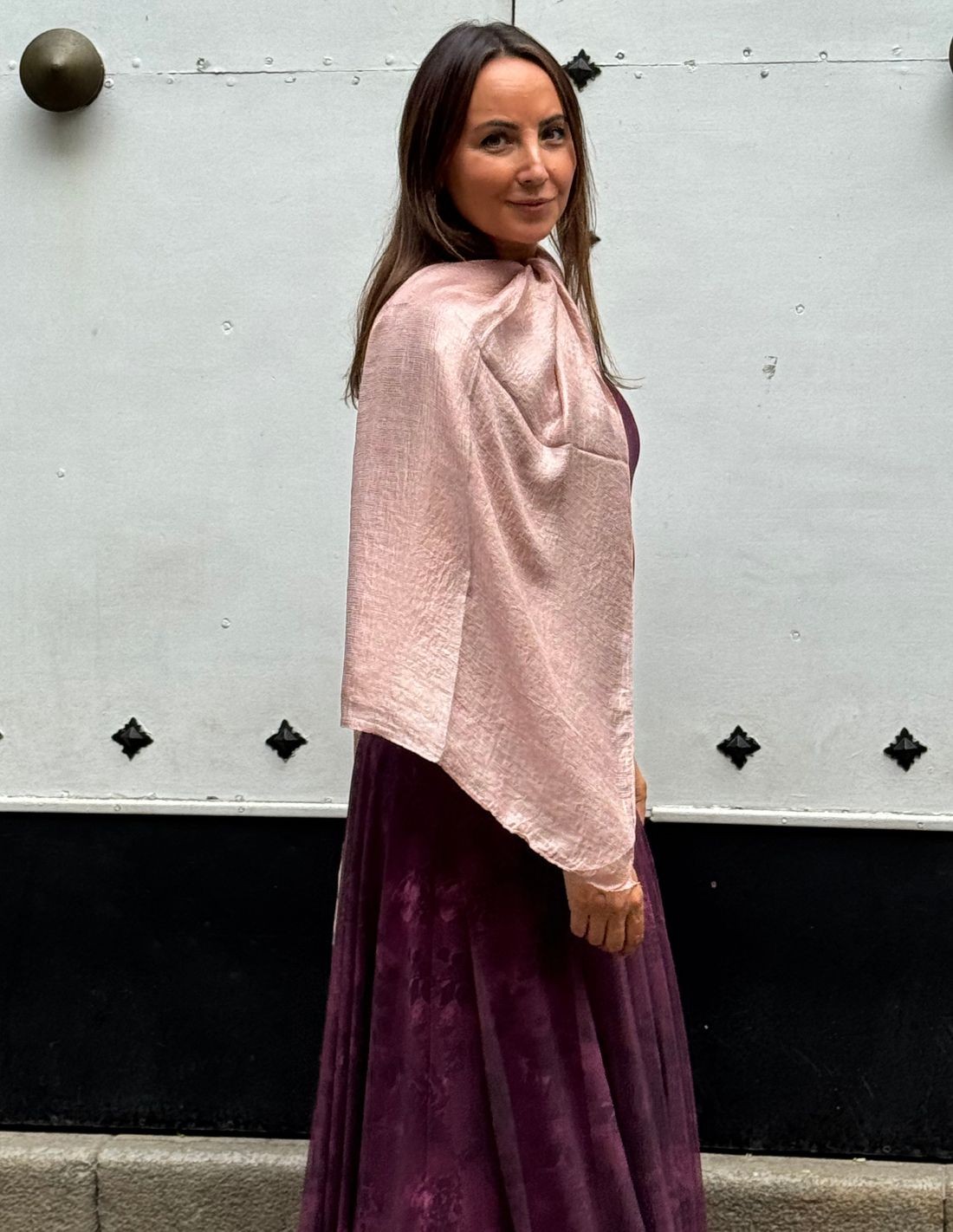 Un chal confeccionado en textura satinada en tejido con toques brillantes, el complemento ideal si deseas darle un toque de estilo y elegancia a tu look de invitada para tu próximo evento de otoño o invierno. Perfecto para tapar los hombros en la iglesia, para abrigarte del frío si tienes una boda de otoño o invierno o incluso para darle un toque diferencial a tu vestido.