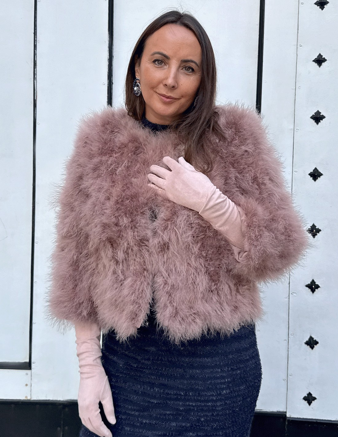 Chaqueta de pluma de avestruz en color rosa maquillaje PARA INVITADA a bodas y eventos