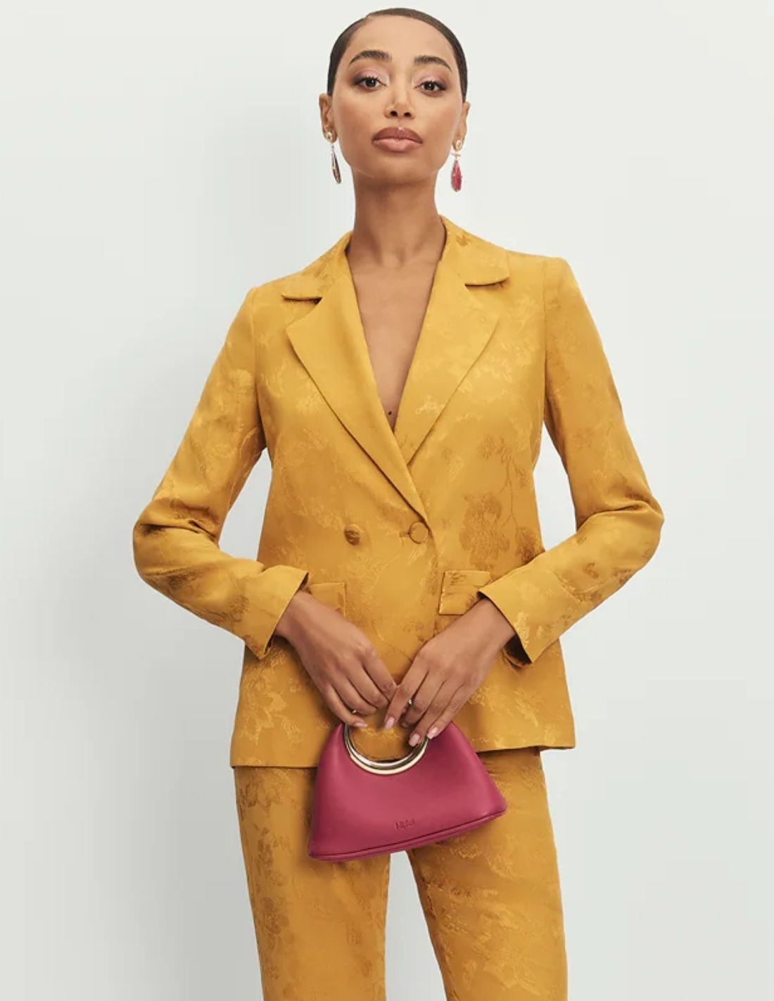 La blazer mostaza fusiona elegancia clásica y estilo contemporáneo. Confeccionada en jacquard 100% viscosa, su textura con relieve sutil y caída fluida aporta un aire sofisticado y actual. Presenta solapas clásicas, hombreras estructuradas y botones forrados en el mismo tejido, además de un fajín a juego que define la cintura y realza la silueta.
