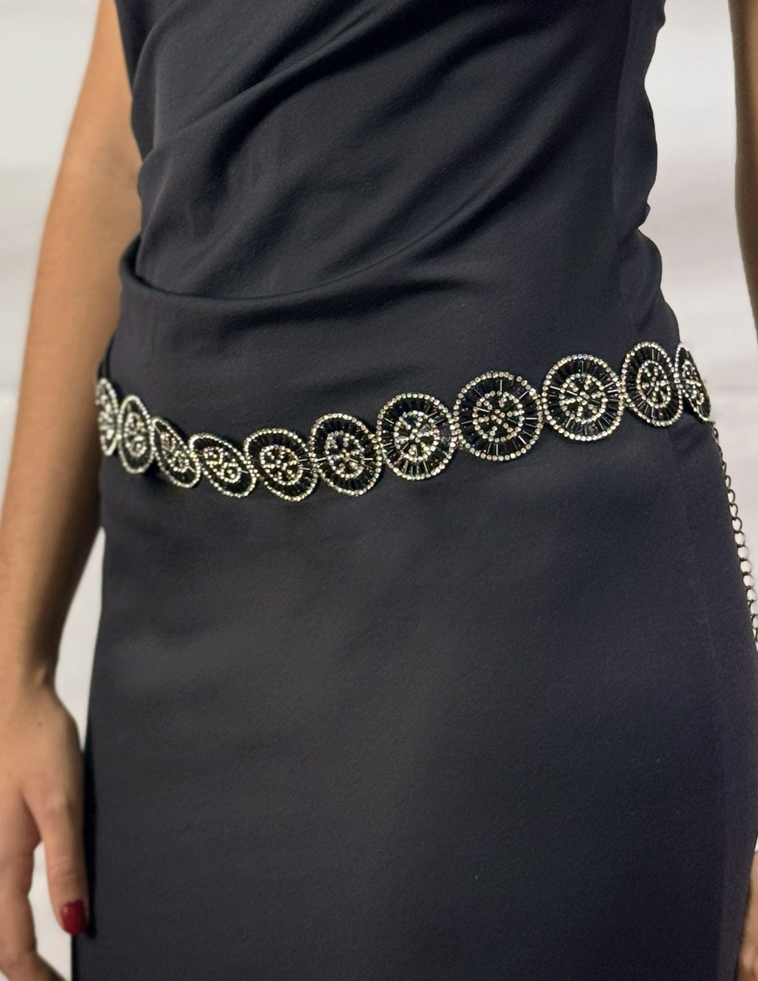 Cinturón de Fiesta Negro con Flores de Pedrería Plateada — Sofisticación con Brillo Sutil