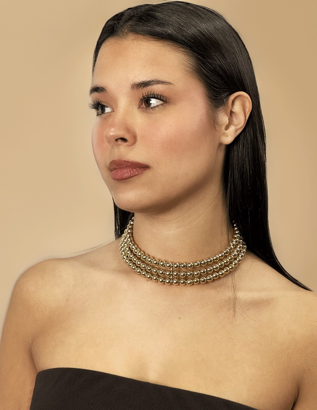 Brilla con estilo con este choker dorado de tres filas de bolitas, una pieza versátil y sofisticada que eleva cualquier look. Su diseño delicado combina la elegancia clásica con un toque moderno, perfecto tanto para eventos especiales como para tu día a día.