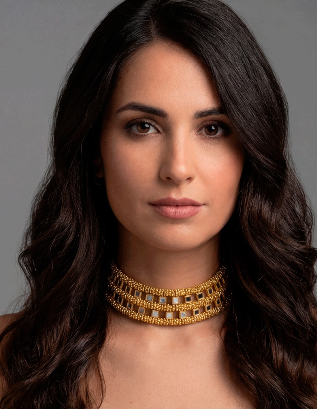 Choker rígido de diseño fino con delicados espejitos, una pieza sofisticada que aporta luz y elegancia de forma sutil.
