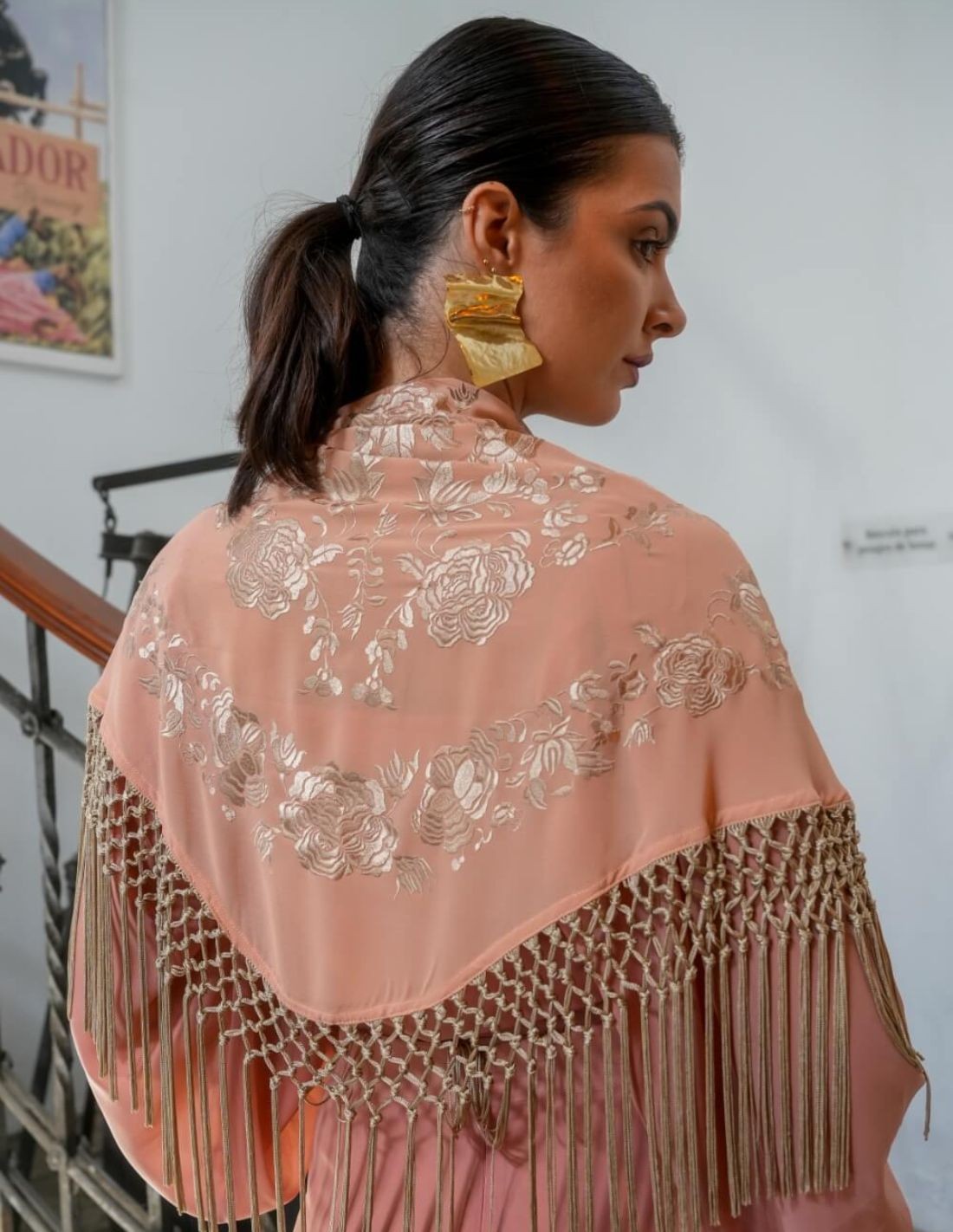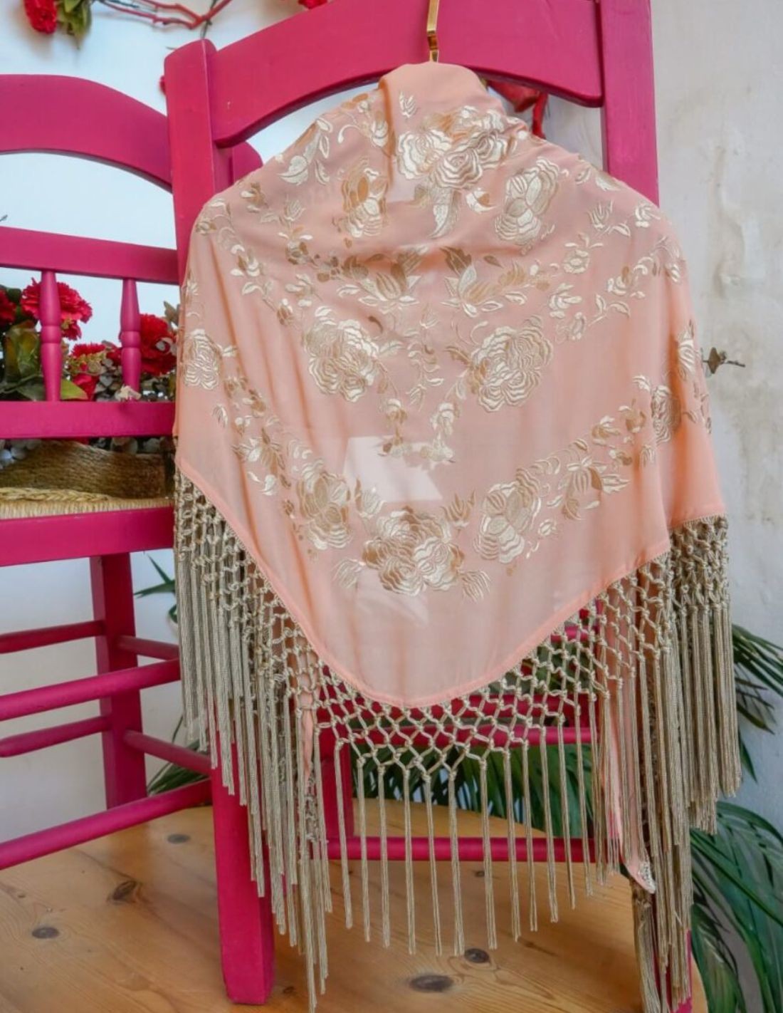El diseño destaca por sus flores bordadas en hilo claro, cuidadosamente trabajadas para crear un contraste sutil y refinado sobre el fondo salmón. El acabado se completa con flecos dorados de caída larga, que añaden dinamismo y un brillo discreto al conjunto. El enrejado decorativo que une los flecos crea un efecto visual único, aportando carácter y personalidad a la prenda. Ideal para ocasiones especiales, eventos, celebraciones o para elevar un estilismo más sencillo, este mantoncillo combina a la perfección con vestidos fluidos, conjuntos de invitada o tajes de flamenca.