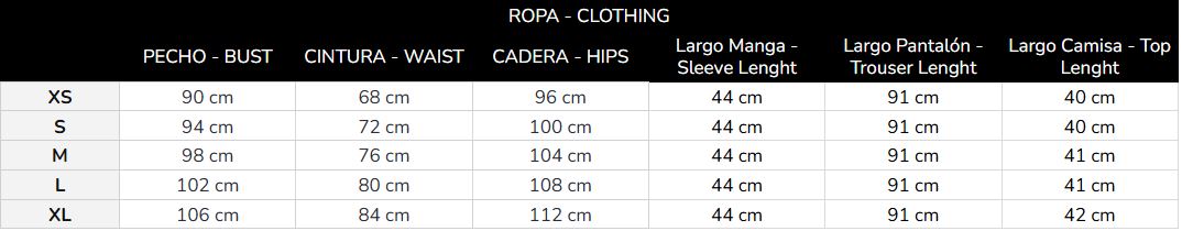 XS - Pecho: 90 cm | Cintura: 68 cm | Cadera: 96 cm | Largo manga: 44 cm | Largo pantalón: 91 cm | Largo camisa: 40 cm.