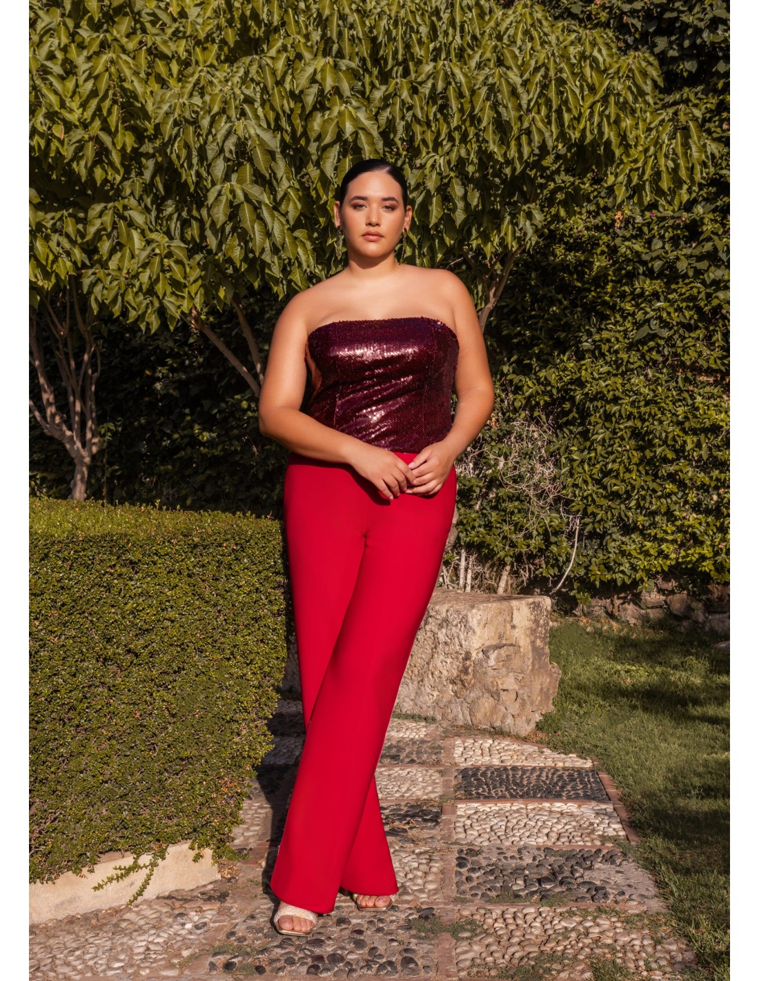 Si quieres ser una invitada original, este conjunto te hará brillar. Compuesto por un top palabra de honor realizado en lentejuelas y pantalón ancho confeccionado en creppé satén. Sin duda, dos piezas que podrás lucir junto o por separado y crear cientos de looks tanto casuales como más elegantes. Perfecto para eventos tanto de día como de tarde.