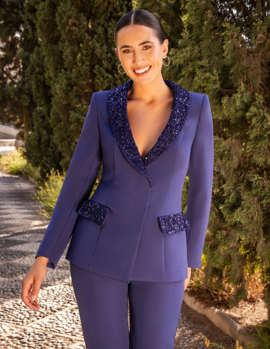 Traje de chaqueta azul marino para invitada con detalles de lentejuelas