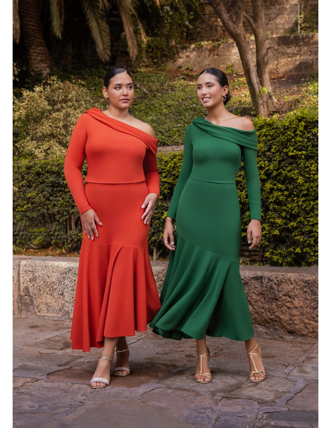 Si quieres lucir espectacular en tu próximo evento, este conjunto de invitada de nueva colección, te hará brillar. Realizado con top de manga larga y escote asimétrico, súper favorecedor y elegante. La falda incluye un bajo con corte midi y con diseño plisado. Sin duda, un diseño muy elegante y versátil que podrás lucir tanto junto como por separado. Serás la invitada perfecta en eventos tanto de otoño como de invierno.