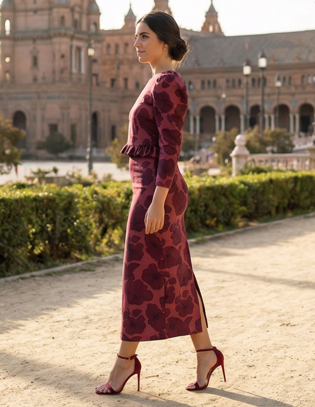 Este conjunto de dos piezas combina elegancia y sencillez en un diseño muy favorecedor. Está formado por un top de manga larga y una falda midi a juego, confeccionados en un tejido con un delicado estampado floral. Los tonos burdeos y granate destacan sobre un fondo rosado suave, creando una combinación sofisticada y muy fácil de llevar.