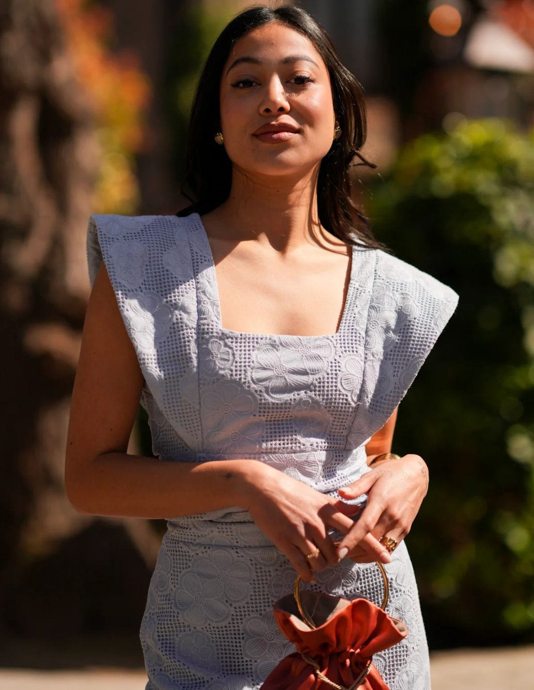 Conjunto dos piezas celeste de top y falda en tejido perforado, elegante y fresco para eventos especiales. Su diseño femenino y sofisticado aporta un look romántico, favorecedor y lleno de estilo.
