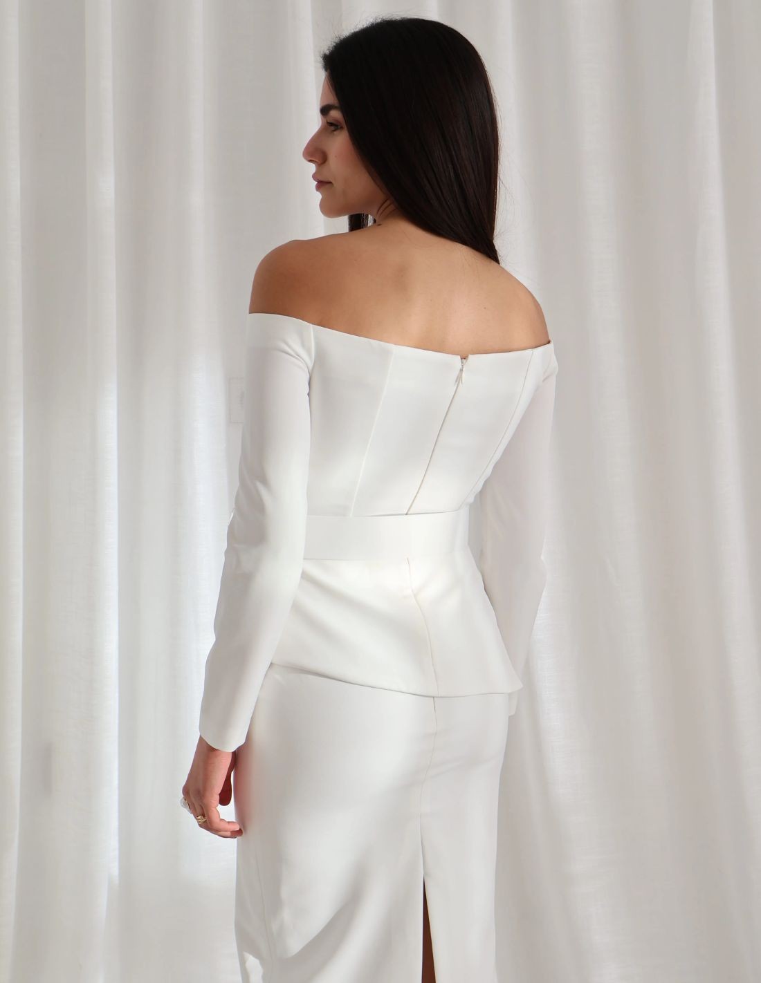 Conjunto en color mantequilla con top asimétrico con escote Bardot, cinturón a juego y falda midi con abertura trasera. Elegante y favorecedor.