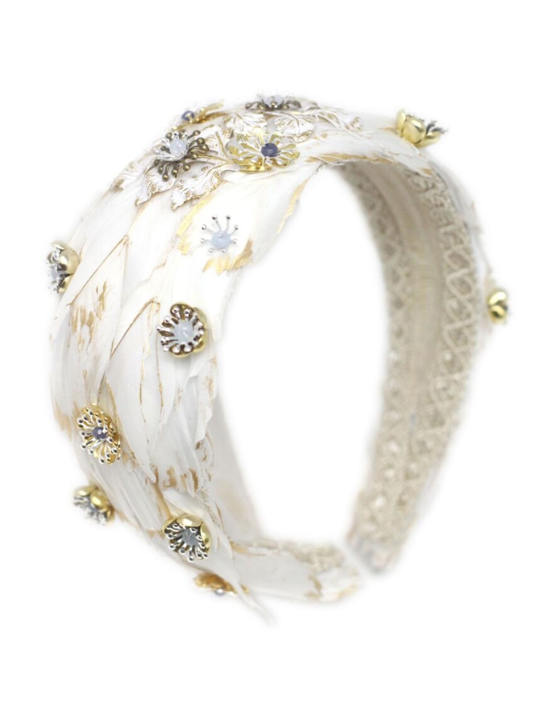 Elegante y luminosa, esta diadema para invitada de plumas blancas es una pieza delicada que aporta sofisticación y un toque joya a cualquier look de ceremonia. Confeccionada con plumas en tonos blancos, destaca por su textura ligera y su acabado, ideal para bodas y eventos especiales. El diseño se enriquece con un decorado joya, que combina detalles en tonos dorados y plateados, aportando brillo sutil y un aire refinado. Su volumen equilibrado realza el peinado con elegancia, tanto en recogidos como en semirrecogidos. Esta diadema está diseñada y fabricada artesanalmente en España.