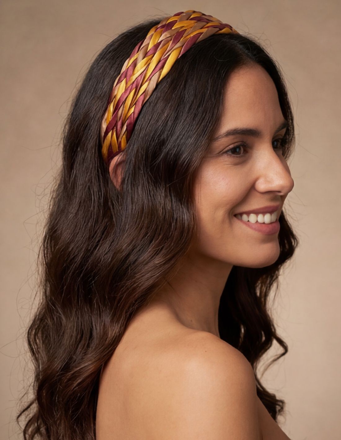 El diseño trenzado aporta volumen y un acabado muy favorecedor que enmarca el rostro con suavidad, mientras que el tejido en raso le da un aspecto delicado y refinado. Además, es ligera y cómoda, ideal para llevar durante horas sin renunciar al estilo.