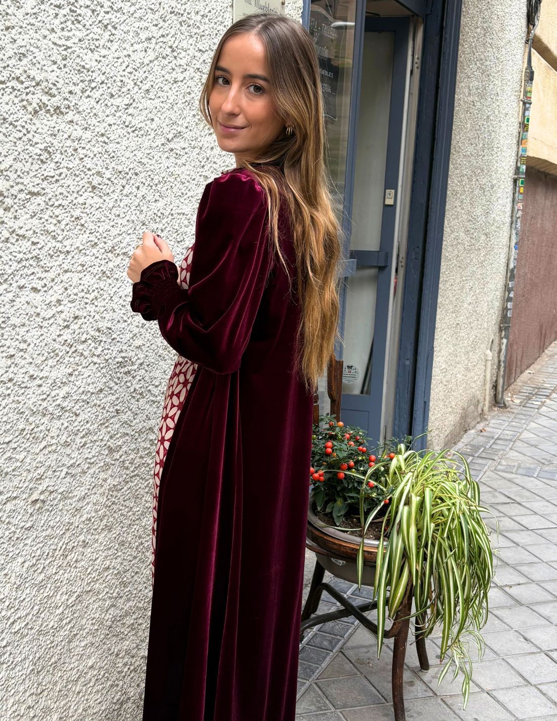 Completa tu look de invitada con complementos que marquen la diferencia y eleva tu look al máximo nivel, con este kimono de invitada. Un kimono confeccionado en tejido de terciopelo en color granate, con detalle de frunces incluidos en los puños de las mangas. El complemento ideal para todo look de invitada sobre todo para temporadas de otoño/invierno.