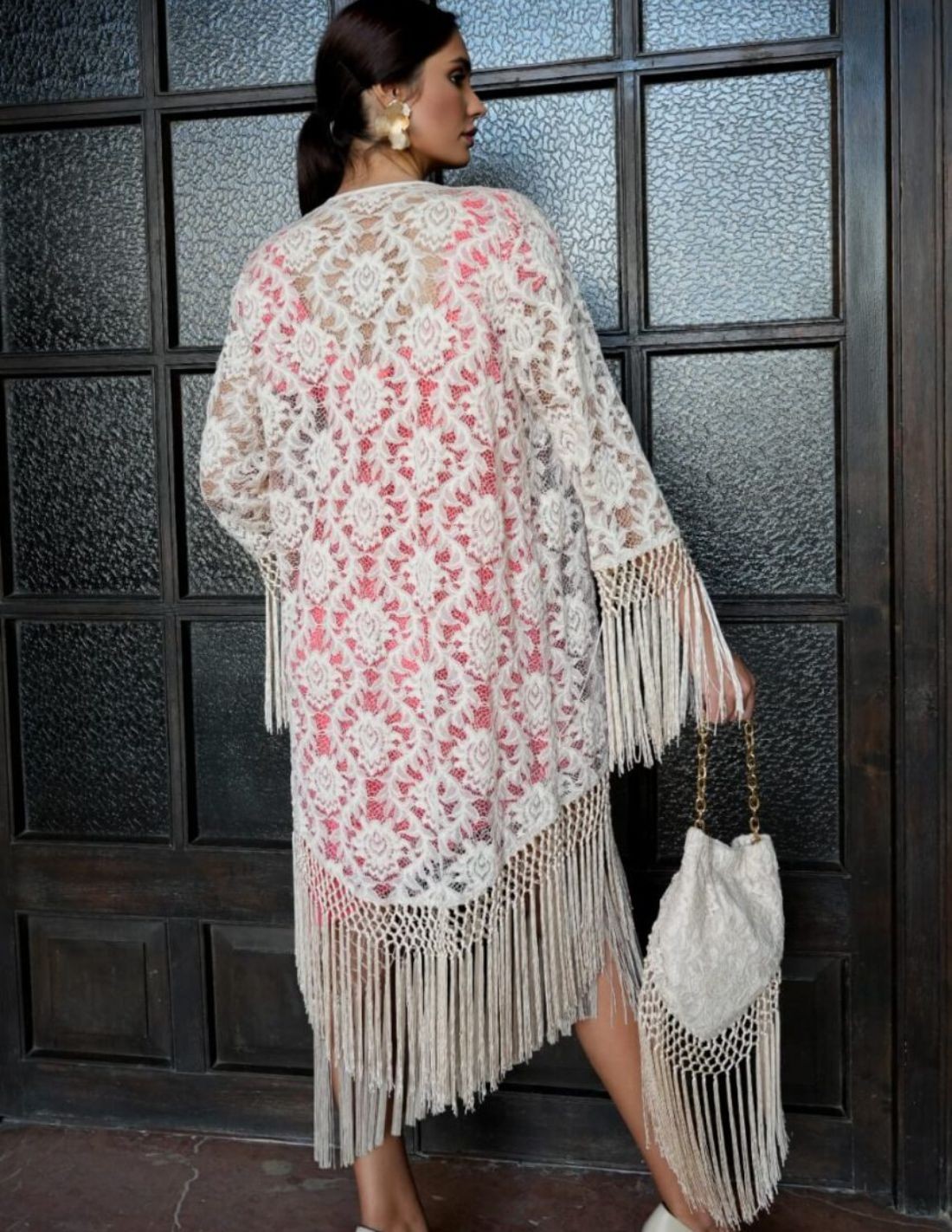 Kimono en color crudo confeccionado en encaje de flores con flecos