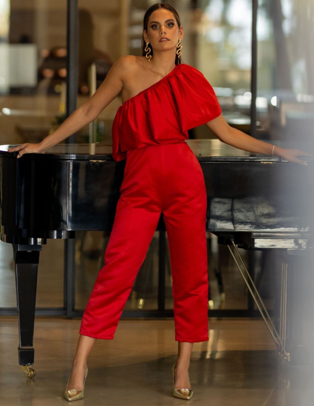 Eleva tu estilo con este impresionante mono asimétrico rojo con volante, confeccionado en un exquisito tejido sedoso y estructurado que aporta sofisticación y movimiento. Su elegante escote asimétrico deja un hombro al descubierto, creando un efecto asimétrico que realza la silueta con un aire moderno y distinguido. El gran volante dramático y exuberante añade volumen y dinamismo, convirtiéndolo en una pieza única y llamativa.