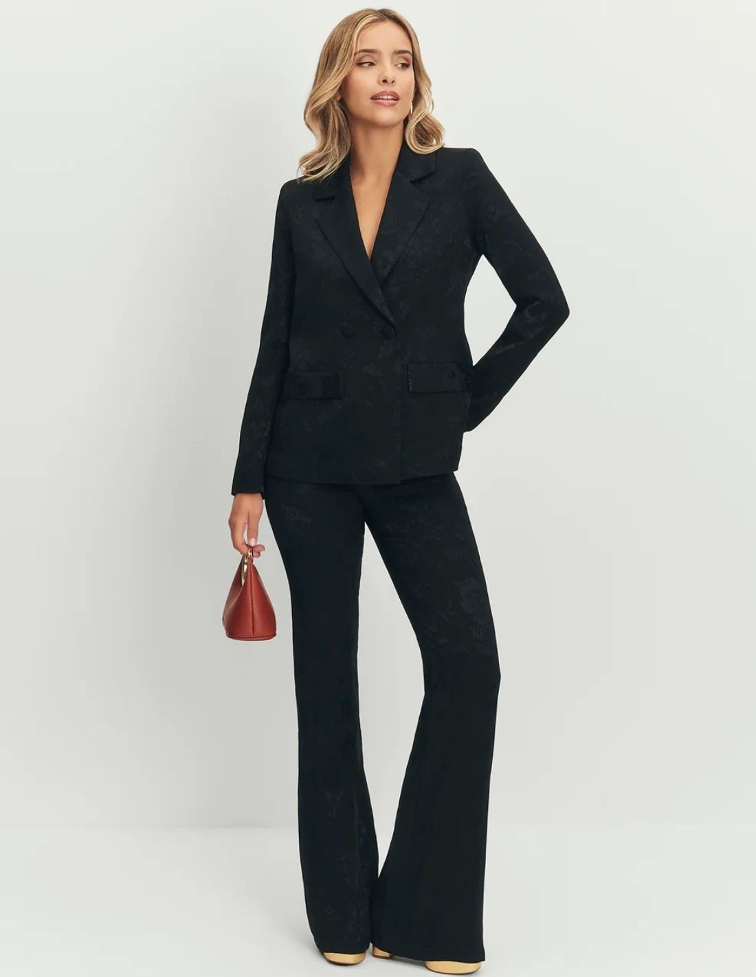 El pantalón negro es la pieza ideal para elevar cualquier look con elegancia y sofisticación. Confeccionado en jacquard 100% viscosa, su tejido aporta textura, caída fluida y un acabado refinado que resalta la silueta. Su tiro alto estiliza la figura y realza la cintura, mientras que la silueta flare acampanada alarga visualmente las piernas con un movimiento moderno y femenino.