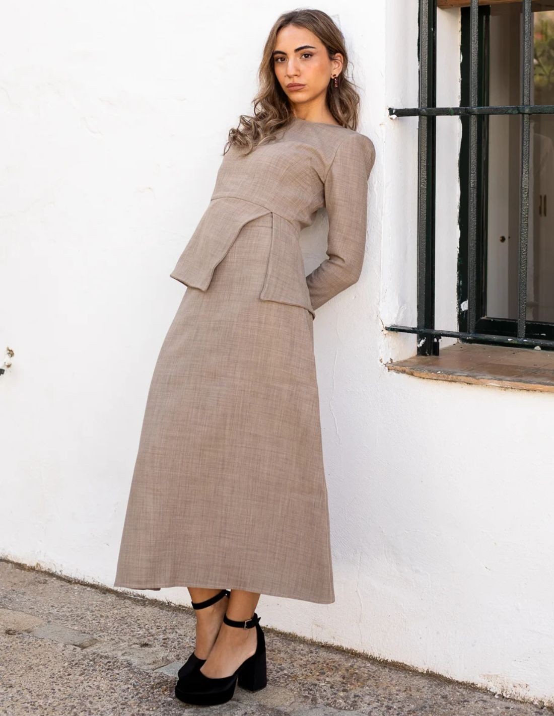 Si apuestas por conjuntos de dos piezas cómodos y elegantes, esta falda con diseño midi evasé en color beige puede ser la opción ideal para tu próximo evento, combinada con el top que completa el set o incluso con la chaqueta. Un look ideal y versátil para llevar tanto de manera formal como para cualquier ocasión a la que desees ir más casual. Confeccionada 100% en poliéster.