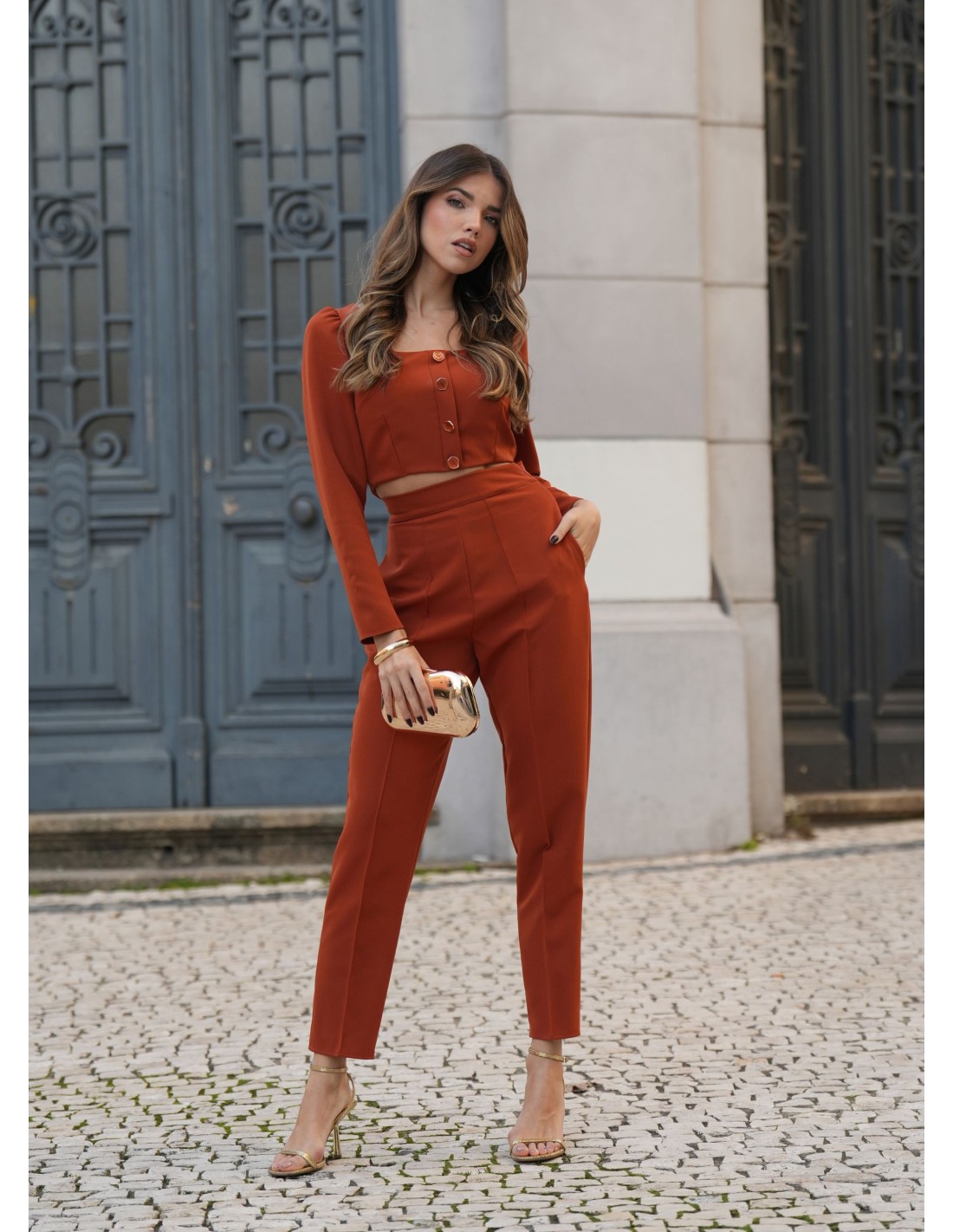 Pantalón de tiro alto terracota con bolsillos laterales y cierre invisible elegante