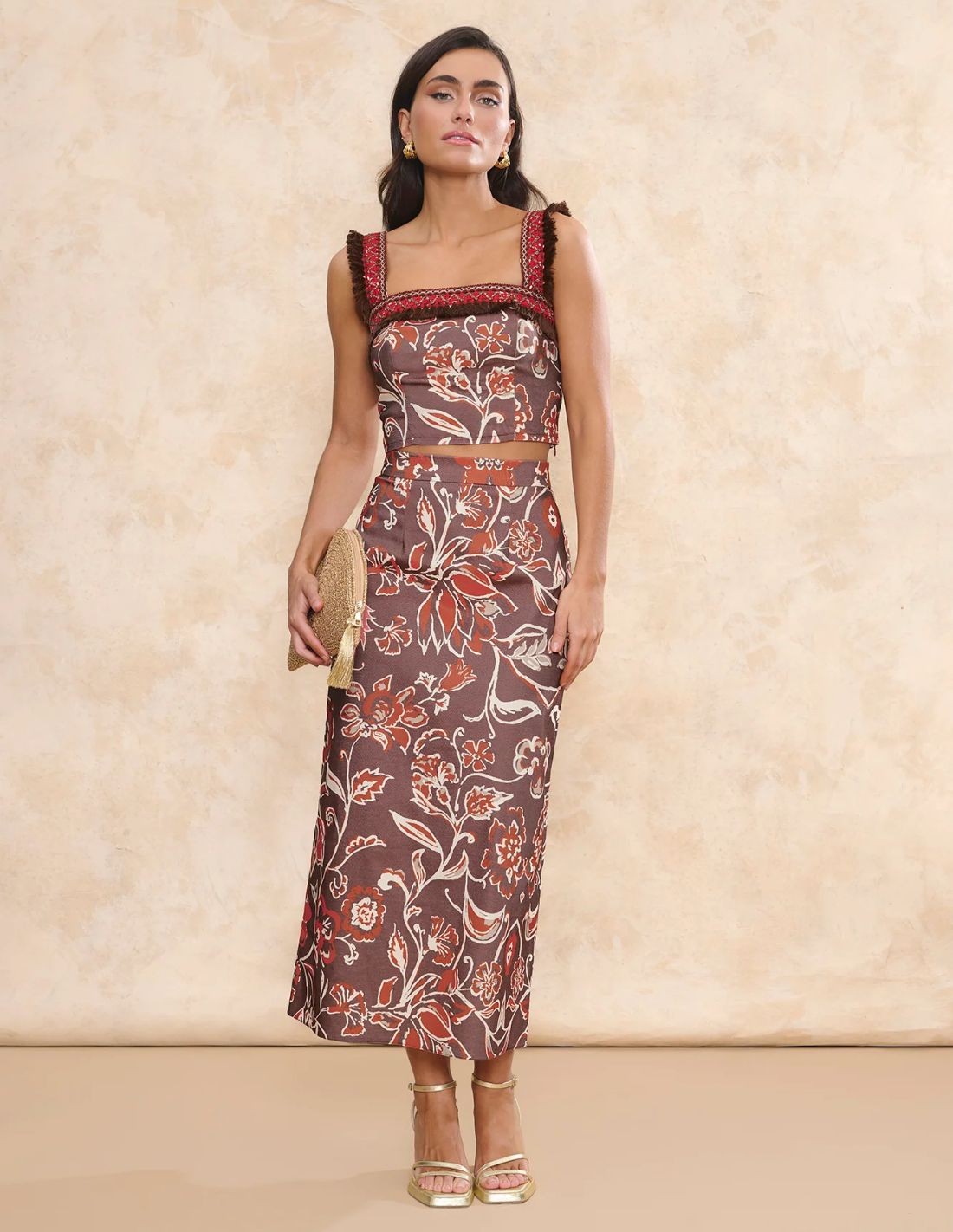 Falda midi estampada marrón con corte evasé