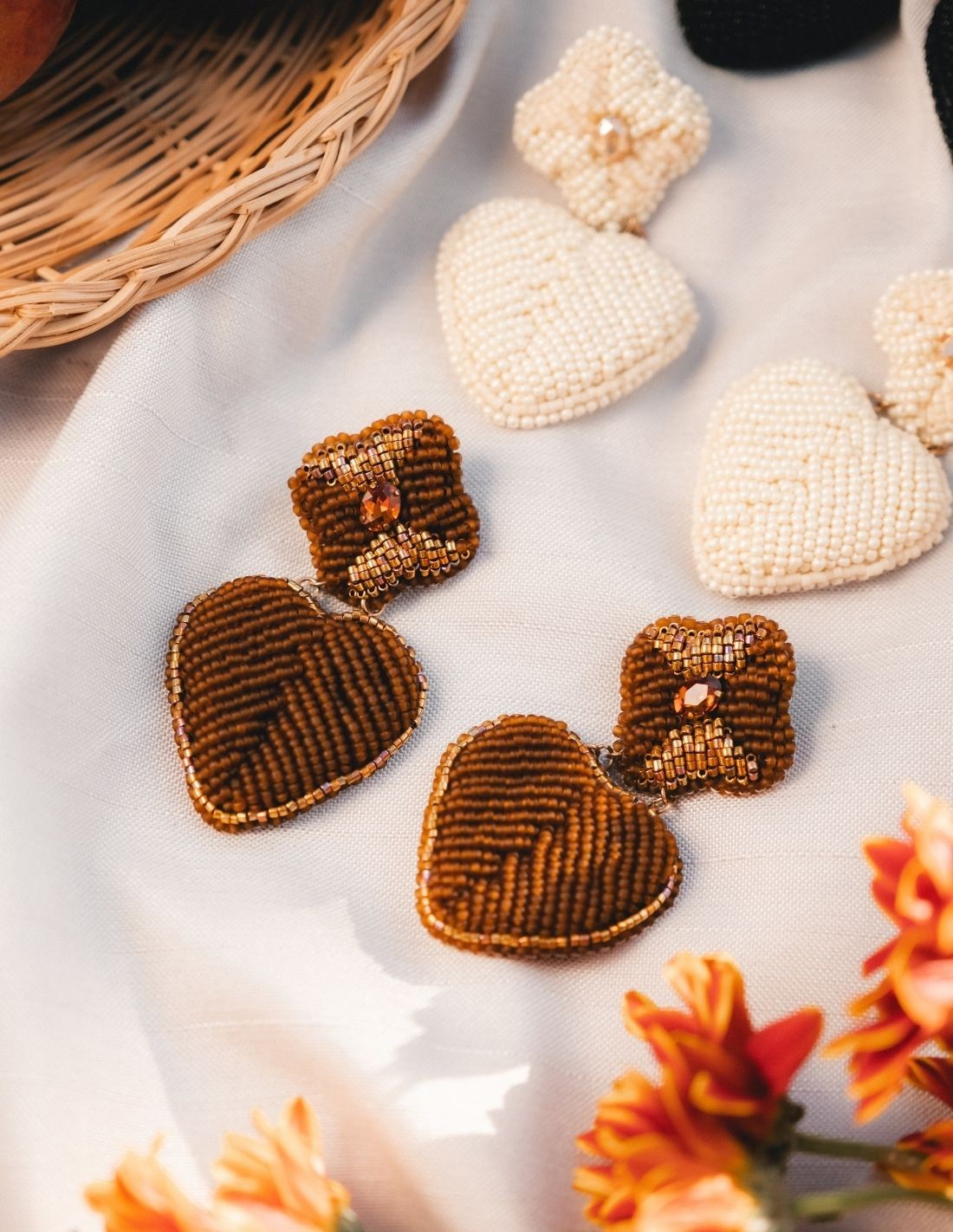 Pendientes flor y corazón bordados a mano con mostacillas