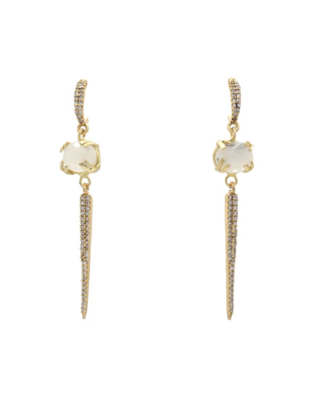 Unos pendientes diseñados para deslumbrar en tu próximo evento, con un diseño que combina una piedra lunar facetada de forma orgánica con una barra alargada cargada de circonitas, creando un juego de brillos y contrastes que harán brillar a toda novia o invitada. Hechos de latón bañado en oro, con detalles que los hacen un complemento sutil y elegante.