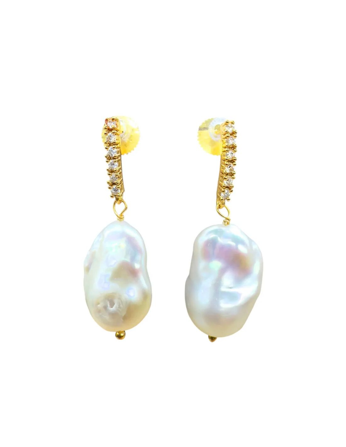 Estos pendientes con diseño elegante y clásico compuestos por una delicada fila de circonitas engastadas que aportan un brillo sutil y elegante que contrasta con la forma irregular del colgante final de una perla. Ideales para llevar tanto con un look casual y darle un toque especial como con un look de invitada para cualquier ocasión especial. Fabricados en latón bañado en oro.