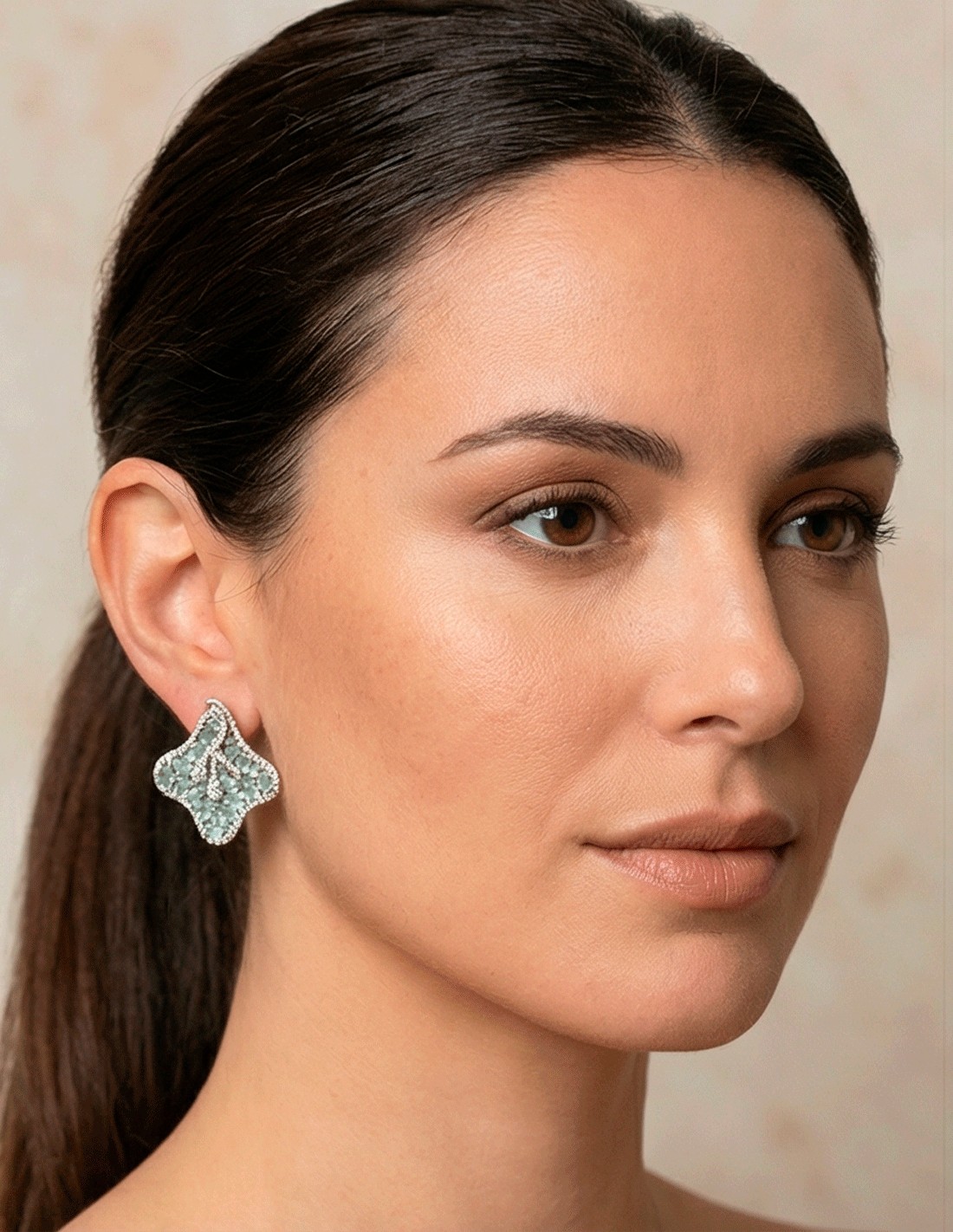 La forma fluida recuerda a los pétalos de la flor de loto, símbolo de armonía, belleza y renovación. Las piedras semipreciosas, cuidadosamente engastadas, reflejan la luz de manera suave, aportando luminosidad al rostro sin resultar excesivas. Su tonalidad pastel es especialmente favorecedora, iluminando la piel y aportando un aire sofisticado y sereno.