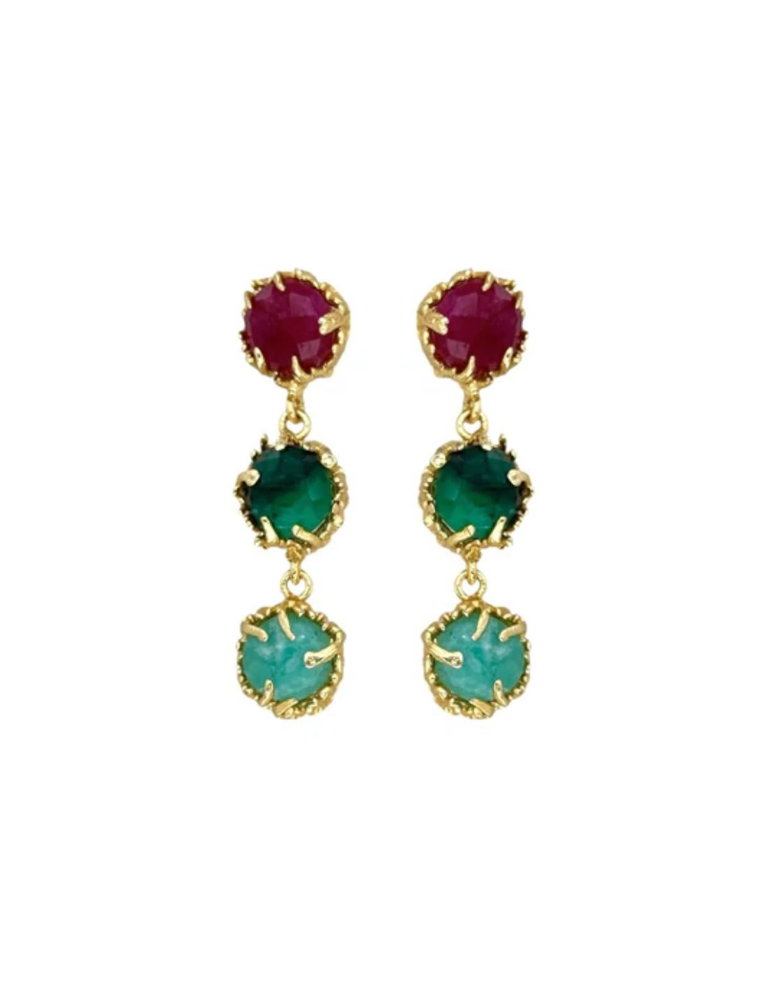 Pendientes con tres piedras redondas en cascada y estructura dorada