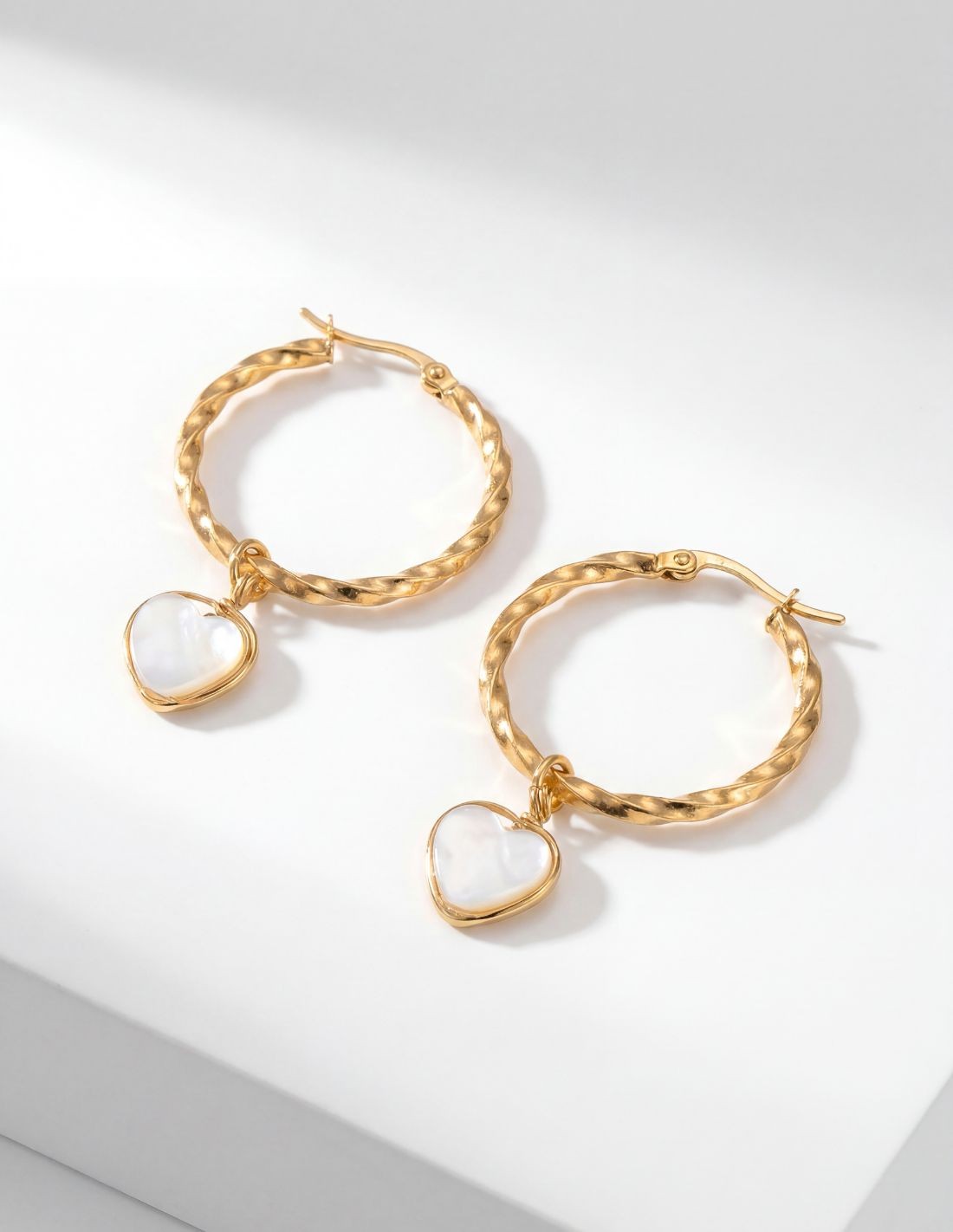 Pendientes de aro dorados con acabado texturizado y delicado colgante de corazón en nácar, que aportan un brillo sutil y elegante. Un diseño romántico y versátil, perfecto para elevar cualquier look con un toque femenino y sofisticado.