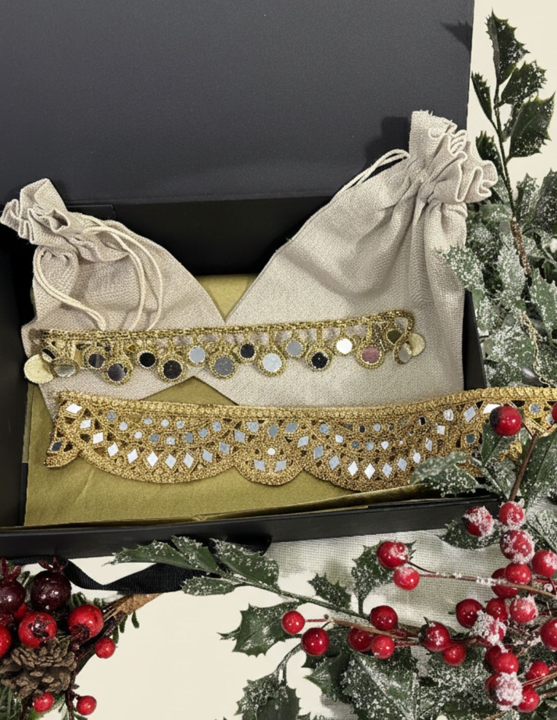 Sorprende esta Navidad con una caja de regalo llena de brillo y encanto. En su interior encontrarás un delicado choker con cristales en forma de gota, ideal para dar un toque elegante a cualquier look y un cinturón dorado con pequeños espejitos, perfecto para añadir un estilo único y sofisticado. Es el detalle ideal para alguien que apuesta por los accesorios con personalidad, capaces de transformar un outfit Un regalo pensado para celebrar, sorprender y hacer sentir especial a quien lo reciba.