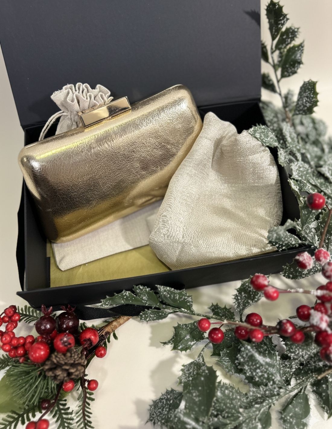 Haz que esta Navidad brille con una caja de regalo que combina elegancia y sofisticación en cada detalle. En su interior, un clutch metalizado dorado, perfecto para acompañar looks festivos o elevar cualquier outfit y un chal dorado de textura satinada, suave, ligero e ideal para aportar estilo y originalidad a cualquier conjunto. Un regalo pensado para sorprender, perfecto para quien disfruta de los accesorios que transforman un look y hacen que cada ocasión se sienta especial.