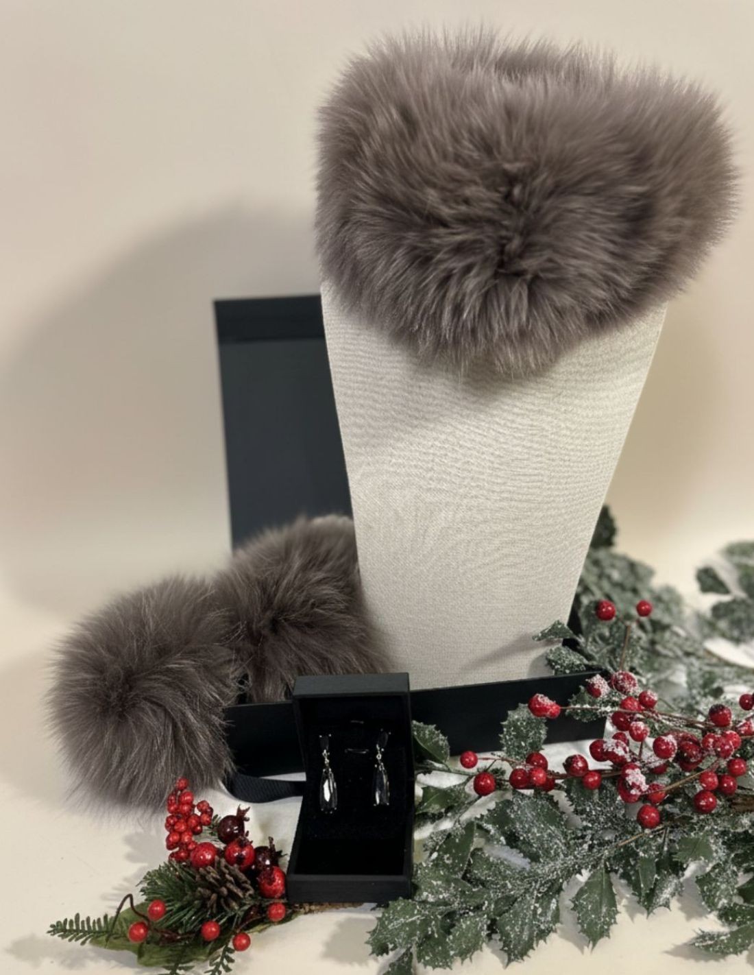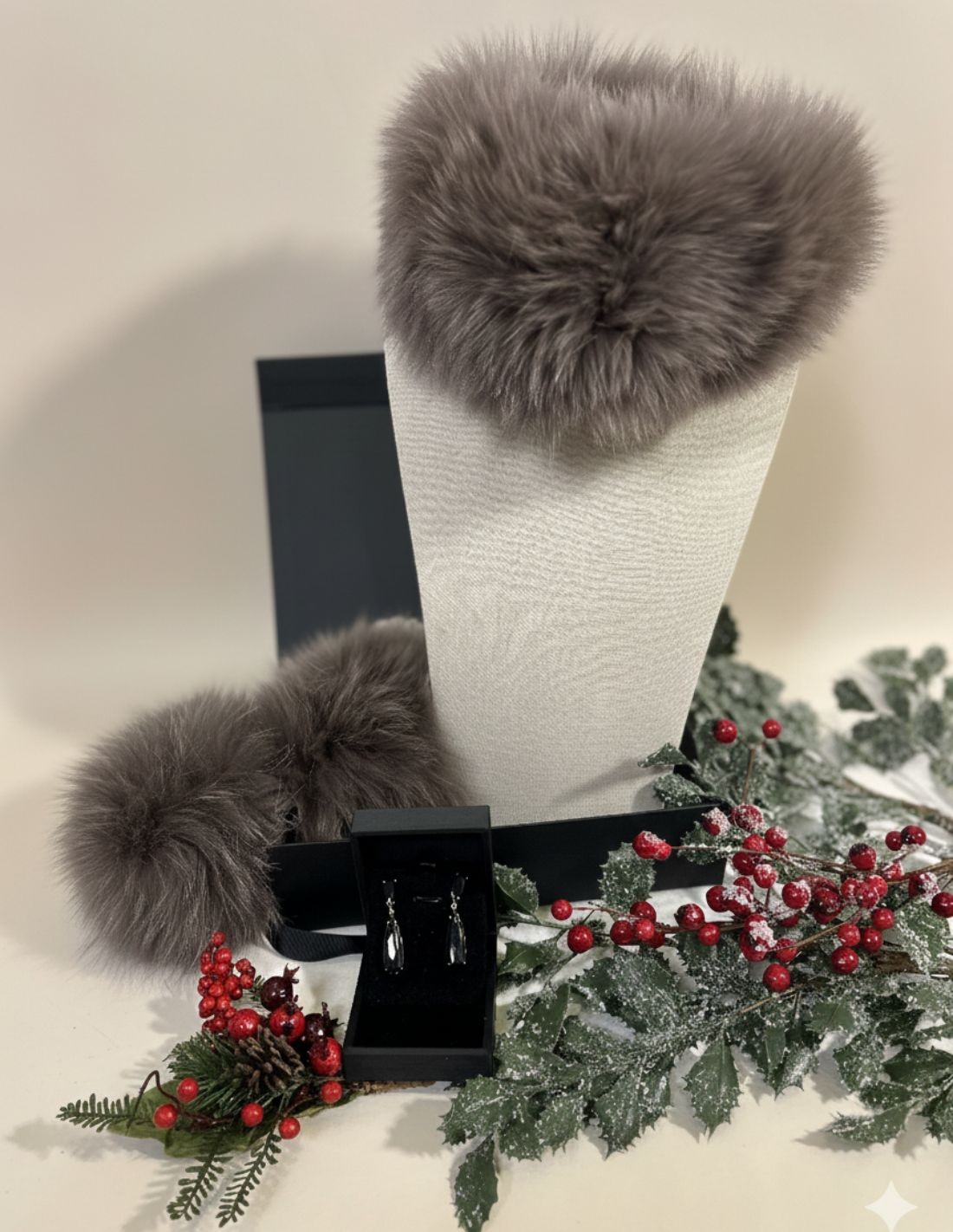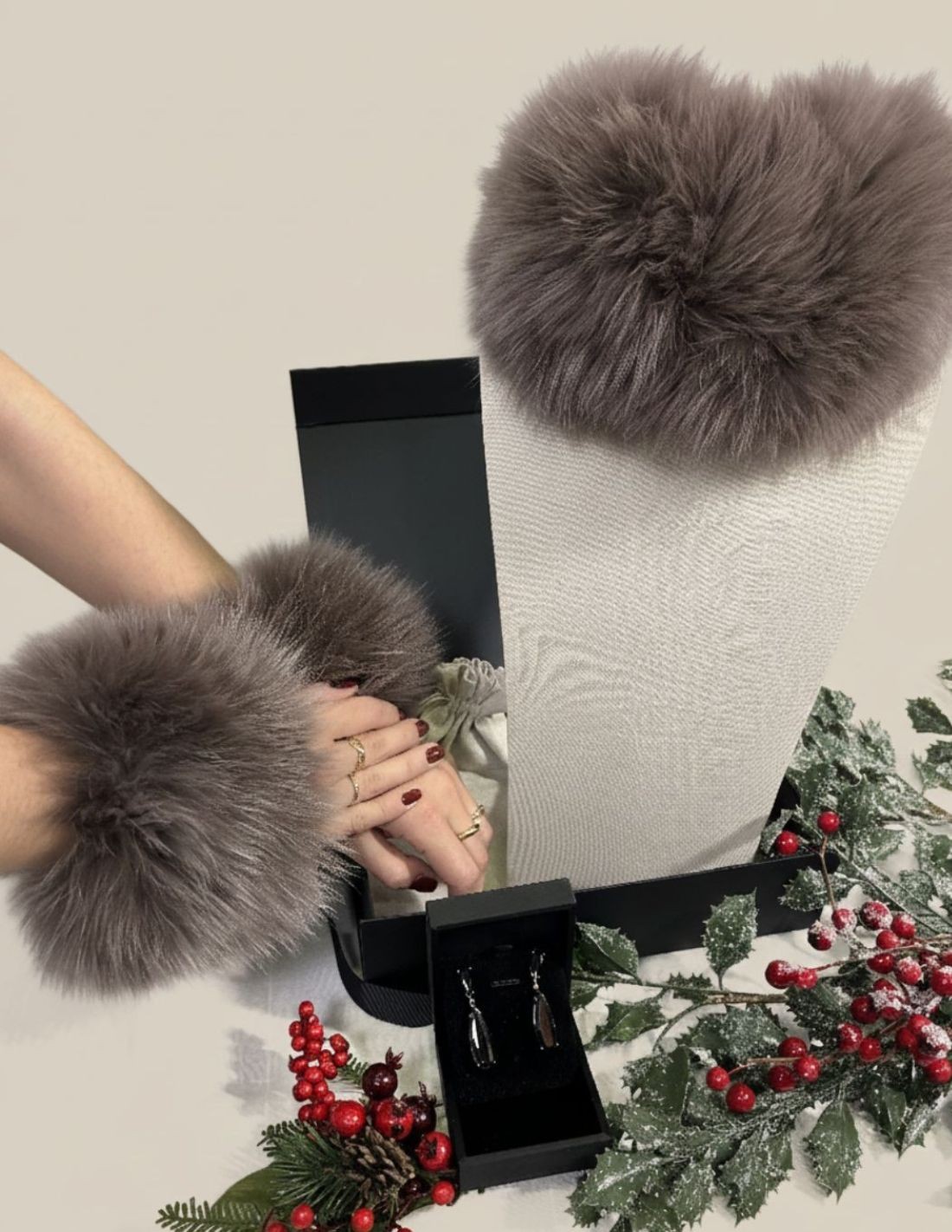 Regala esta Navidad una caja de regalo elegante e ideal para las amantes de los complementos. Dentro encontrarás un cuello y unos puños de pelo en color topo, perfectos para añadir un toque invernal y de estilo a cualquier abrigo o jersey, y unos pendientes negros en forma de gota, sofisticados y versátiles. Un detalle ideal para regalar estas fiestas, tanto a amigas, parejas, madres, hermanas...
