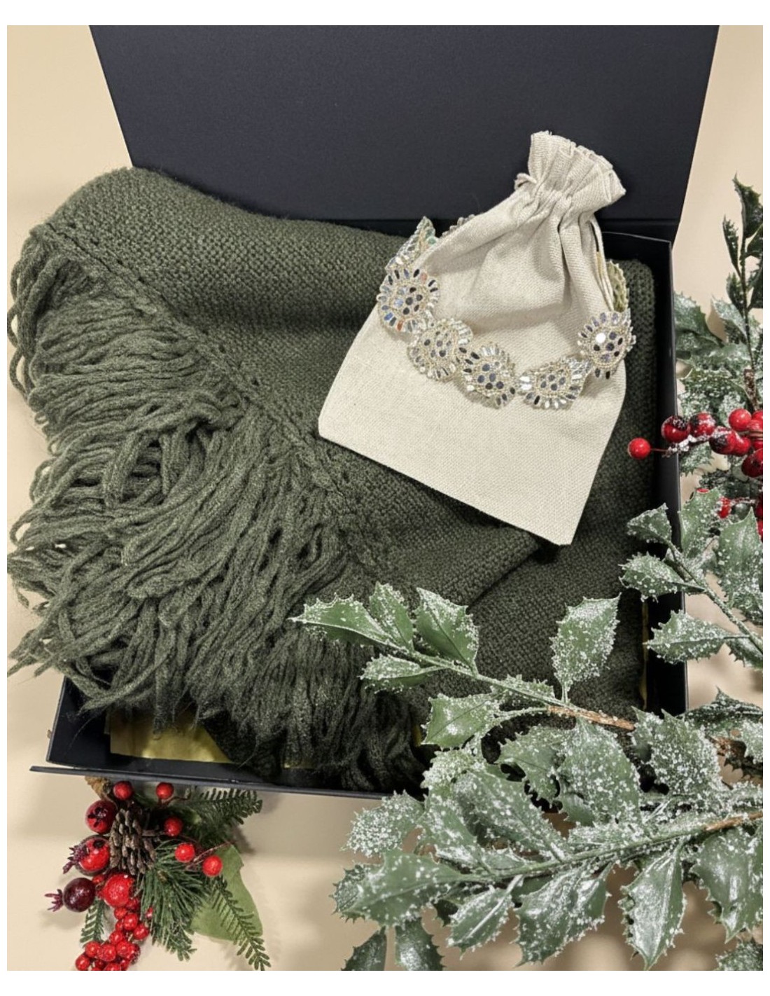 Celebra estas fiestas con una caja de regalo pensada para deslumbrar en cada ocasión. En su interior encontrarás un poncho con flecos, perfecto para aportar un toque y cálido a los looks invernales y un choker con pedrería, elegante y luminoso, ideal para realzar cualquier outfit festivo con un brillo sutil y sofisticado. Ideal para regalar tanto a hermanas, como a parejas, madres...