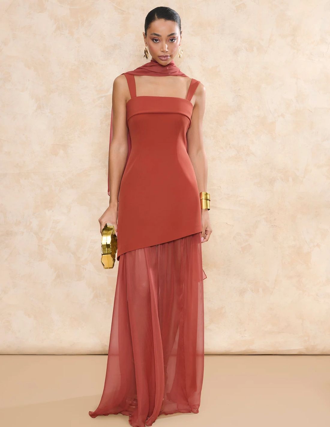 Vestido de invitada largo terracota con falda asimétrica y gasa