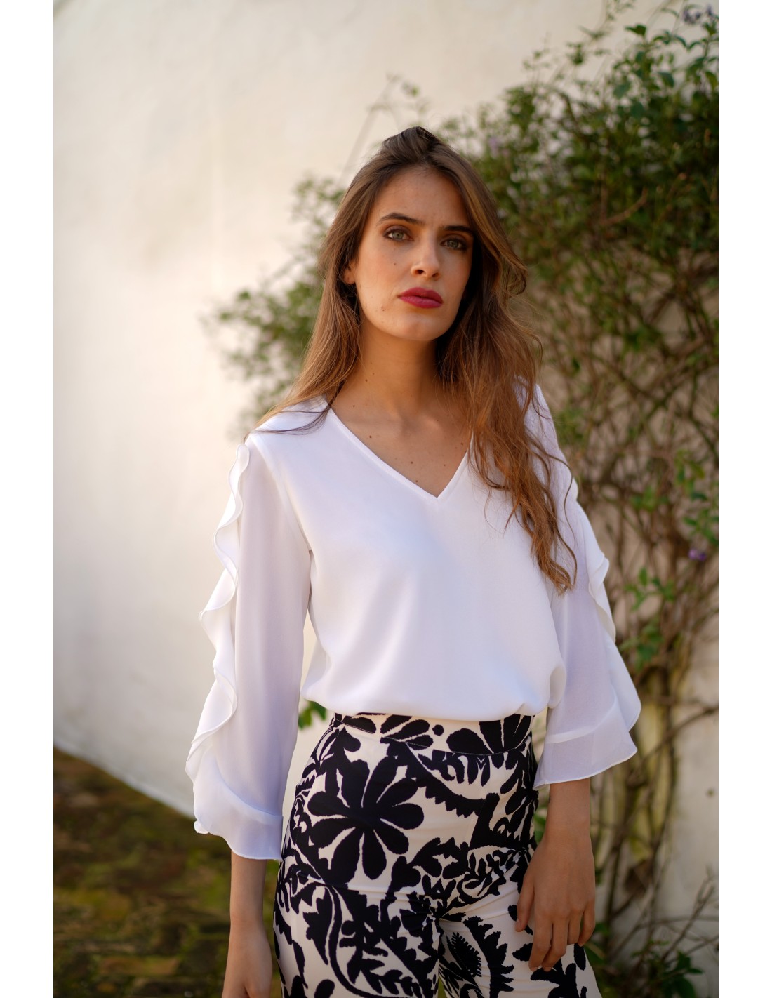 Esta blusa con abertura en el escote y mangas con volante destaca por su diseño moderno, femenino y muy favorecedor. La abertura frontal aporta un toque de frescura y estilo, mientras que las mangas con volantes crean un efecto delicado y sofisticado que eleva cualquier look.