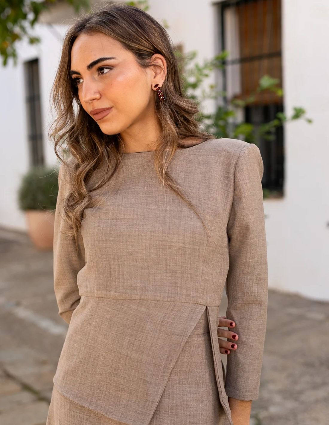 Este top de manga larga en color beige con cintura tipo peplum con abertura en un lateral, será la prenda ideal para llevar en tu próximo evento, muy versátil ya que la podrás combinar tanto con la falda que completa el set como con un pantalón beige del mismo tejido. Ideal para llevarlo tanto de manera formal como casual. Confeccionado 100% en poliéster.