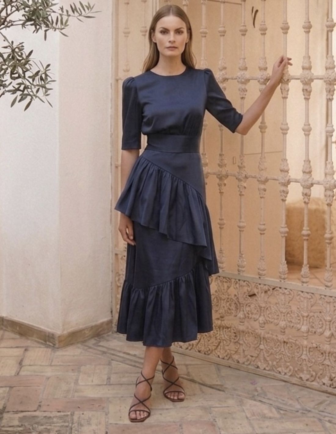 Este top en color azul marino, confeccionado en tafetán, destaca por su elegancia atemporal y su estructura refinada. Su diseño de líneas limpias se equilibra con mangas al codo ligeramente estructuradas, que aportan un aire sofisticado y moderno. El tejido de tafetán, con su sutil brillo y textura firme, realza la silueta y mantiene una caída impecable a lo largo del día. Ideal tanto para ocasiones especiales como para elevar looks de diario, este top combina a la perfección con faldas o pantalones de corte alto, creando un conjunto femenino y pulido. Su tonalidad profunda añade versatilidad, permitiendo transiciones fluidas del día a la noche con solo cambiar los accesorios.