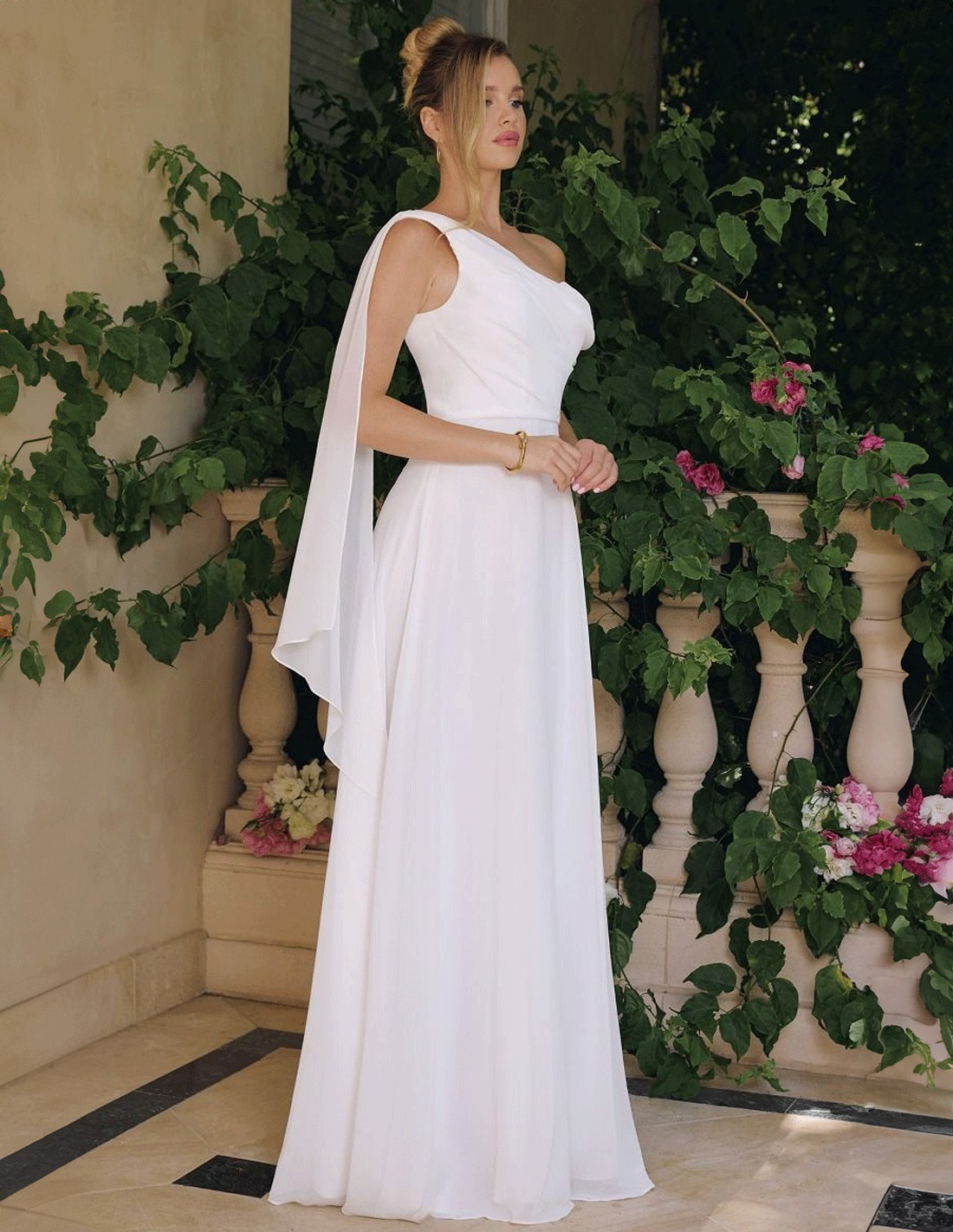 Vestido de novia de estilo griego con escote asimétrico en chiffon | Elegancia y sencillez
