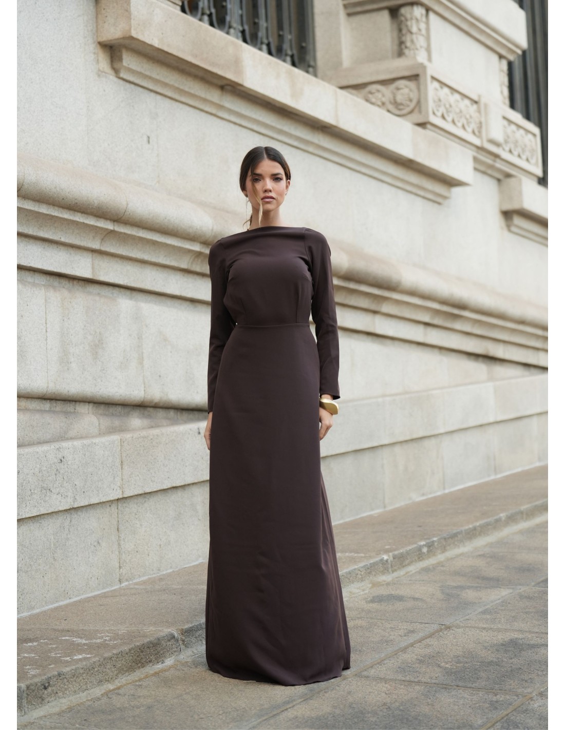 Este vestido largo marrón es la elección perfecta para quienes buscan elegancia, sofisticación y comodidad en una sola prenda. Su escote barco aporta un toque clásico y refinado, mientras que la manga larga lo convierte en una opción ideal para eventos de temporada. La espalda incorpora un delicado escote caído que añade un detalle sorprendente y femenino, equilibrando el diseño con un toque de sensualidad discreta.
