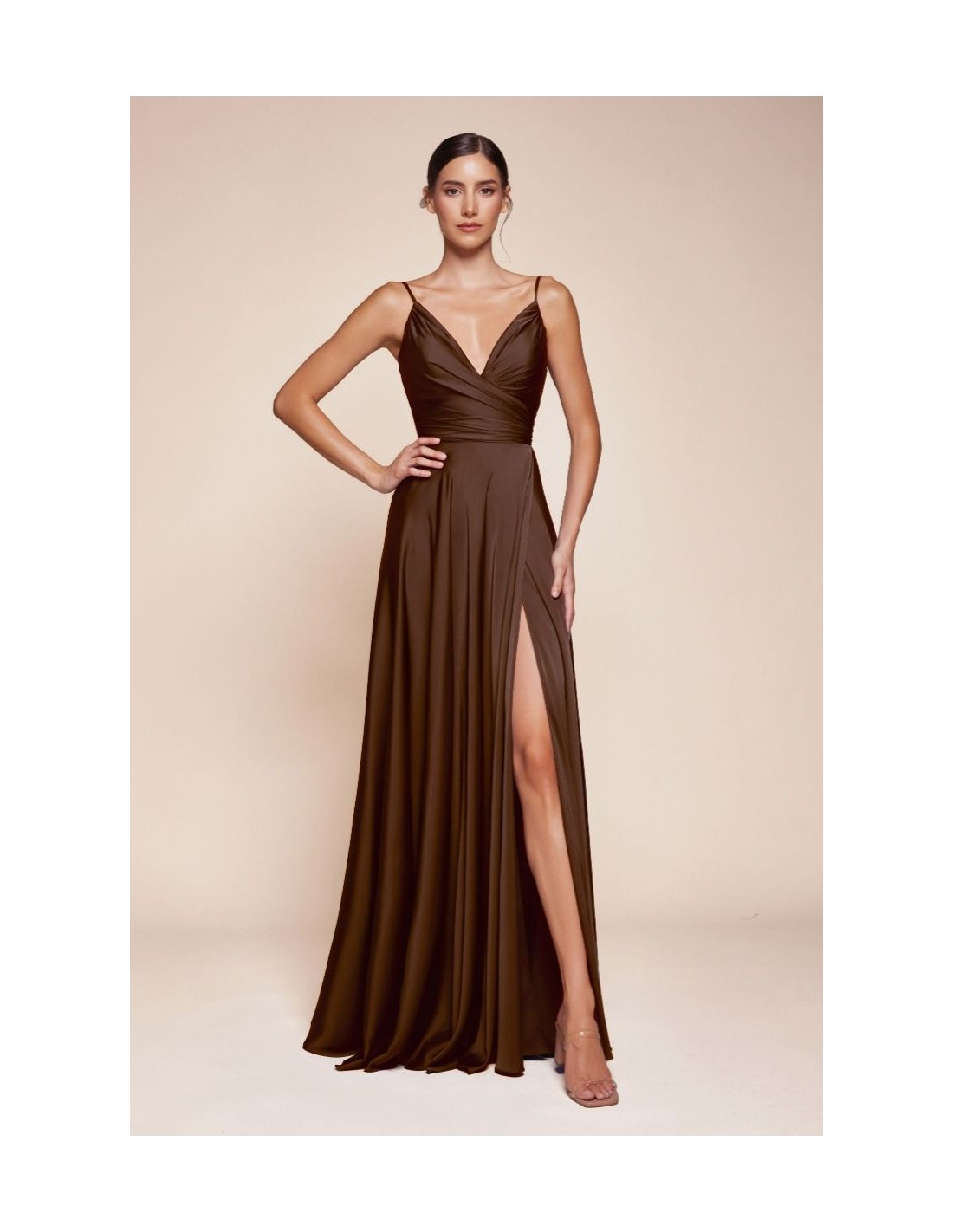 Vestido Largo Satinado de color Marrón con Escote en Pico y Abertura en la pierna. Un vestido realmente espectacular para invitadas elegantes que busquen comodidad en su estilismo.