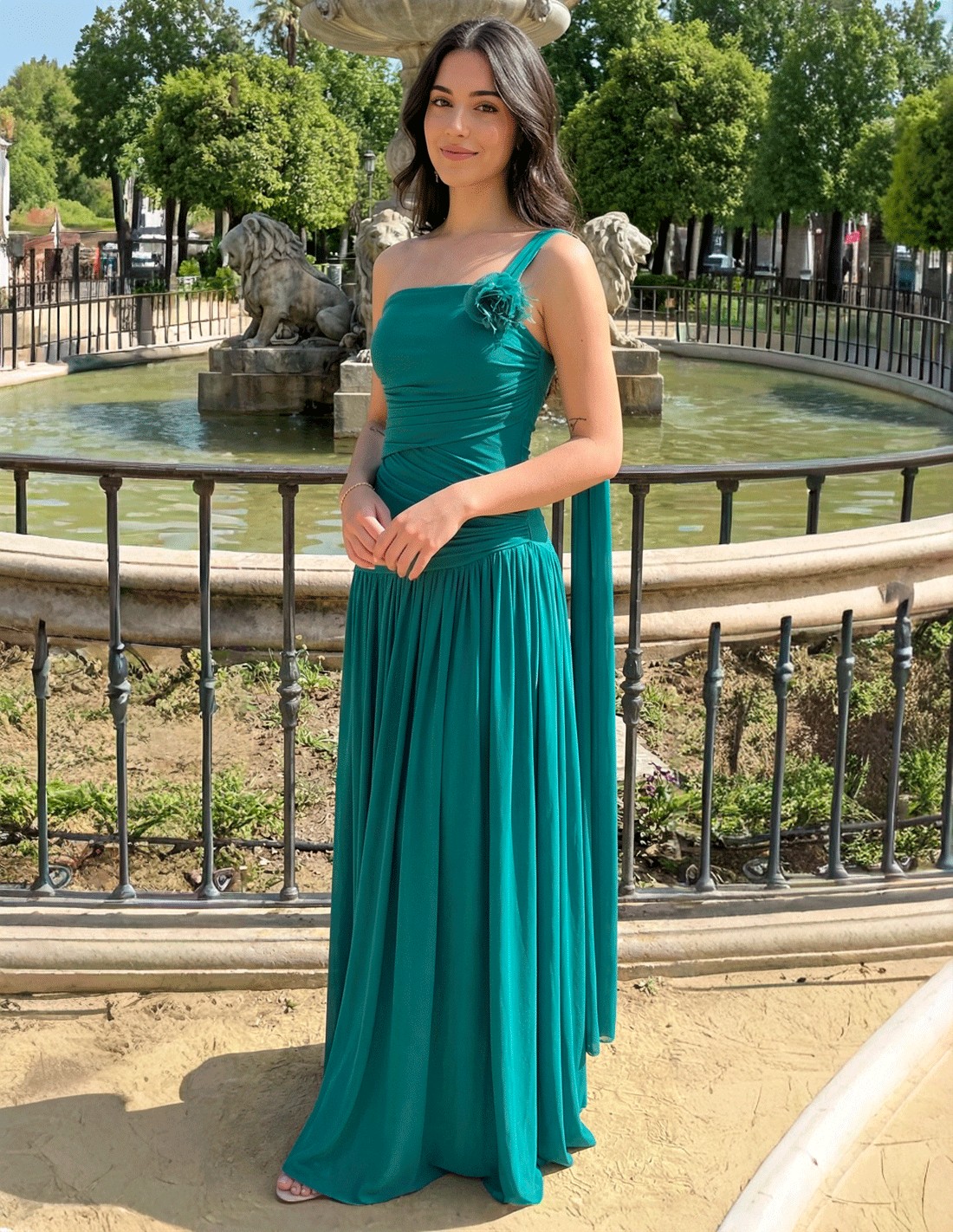 Vestido largo en verde petróleo con cuerpo drapeado, falda vaporosa y espalda ajustable con lazos. Incluye flor decorativa extraíble que puede usarse también como accesorio en el pelo.