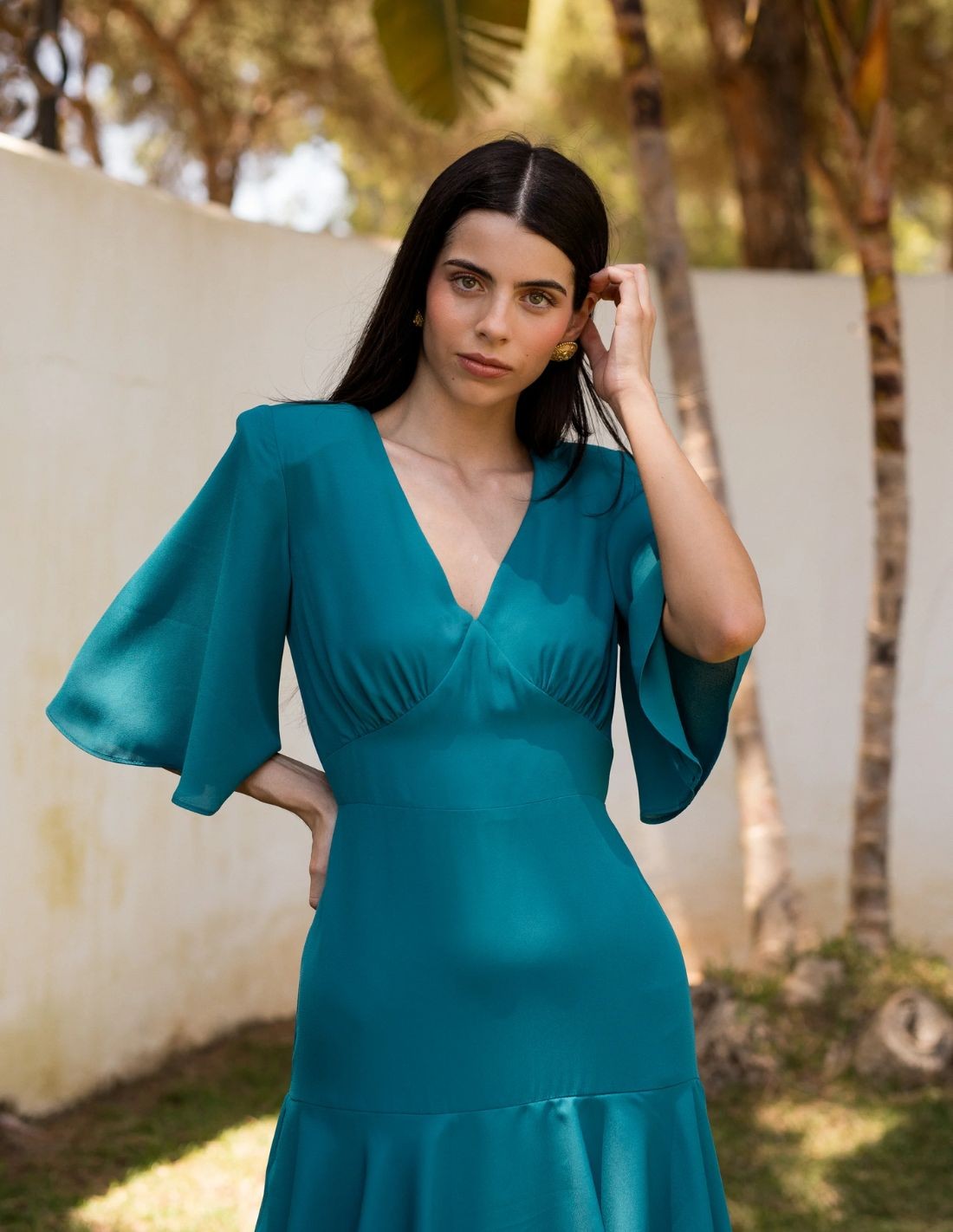 Vestido largo en georgette verde, ligero y elegante, ideal para invitadas de boda en primavera. Cuenta con escote en V, hombreras marcadas, mangas cortas con campana y cuerpo ligeramente ajustado. La falda incorpora cuatro volantes que aportan movimiento y una caída fluida. Un diseño ideal para tus próximos eventos