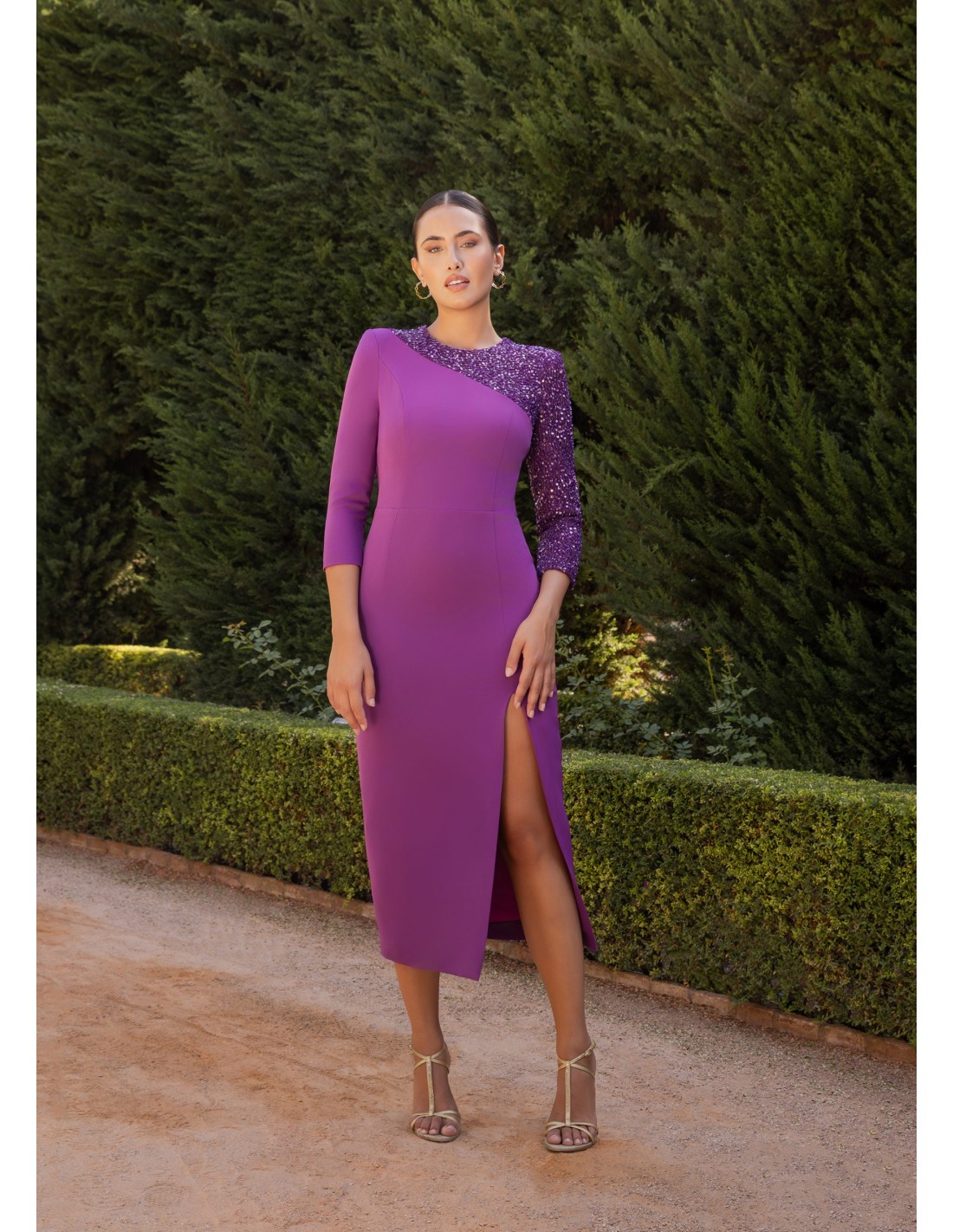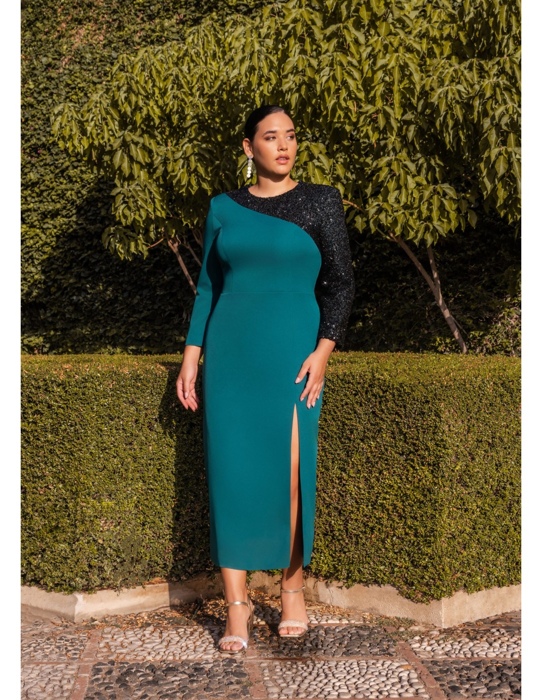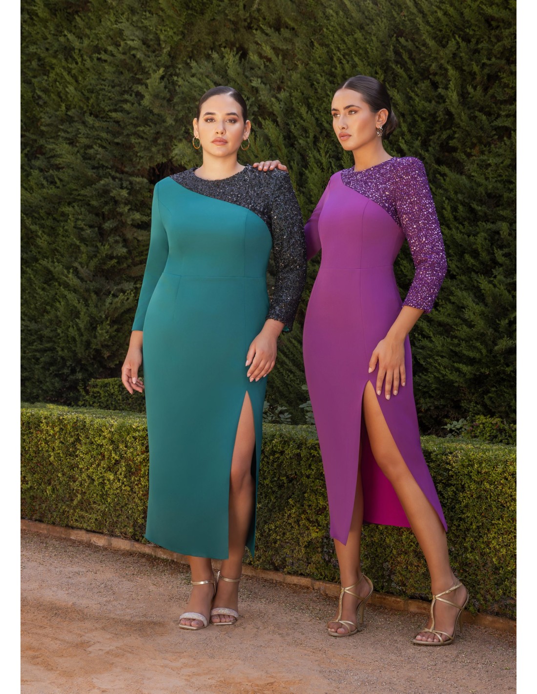 Un diseño especial para brillar en tus eventos de otoño/invierno. Este vestido midi de fiesta podrás lucirlo tanto en eventos de día como de tarde. Confeccionado en crepé, elegante y que se ajusta perfectamente a la figura. Combinado con detalle de lentejuelas en una manga y escote en un tono parecido en contraste. Sin duda, un diseño sofisticado con el que no vas a fallar. Incorpora escote cerrado también, abertura lateral y hombreras. ¡Serás una invitada perfecta!