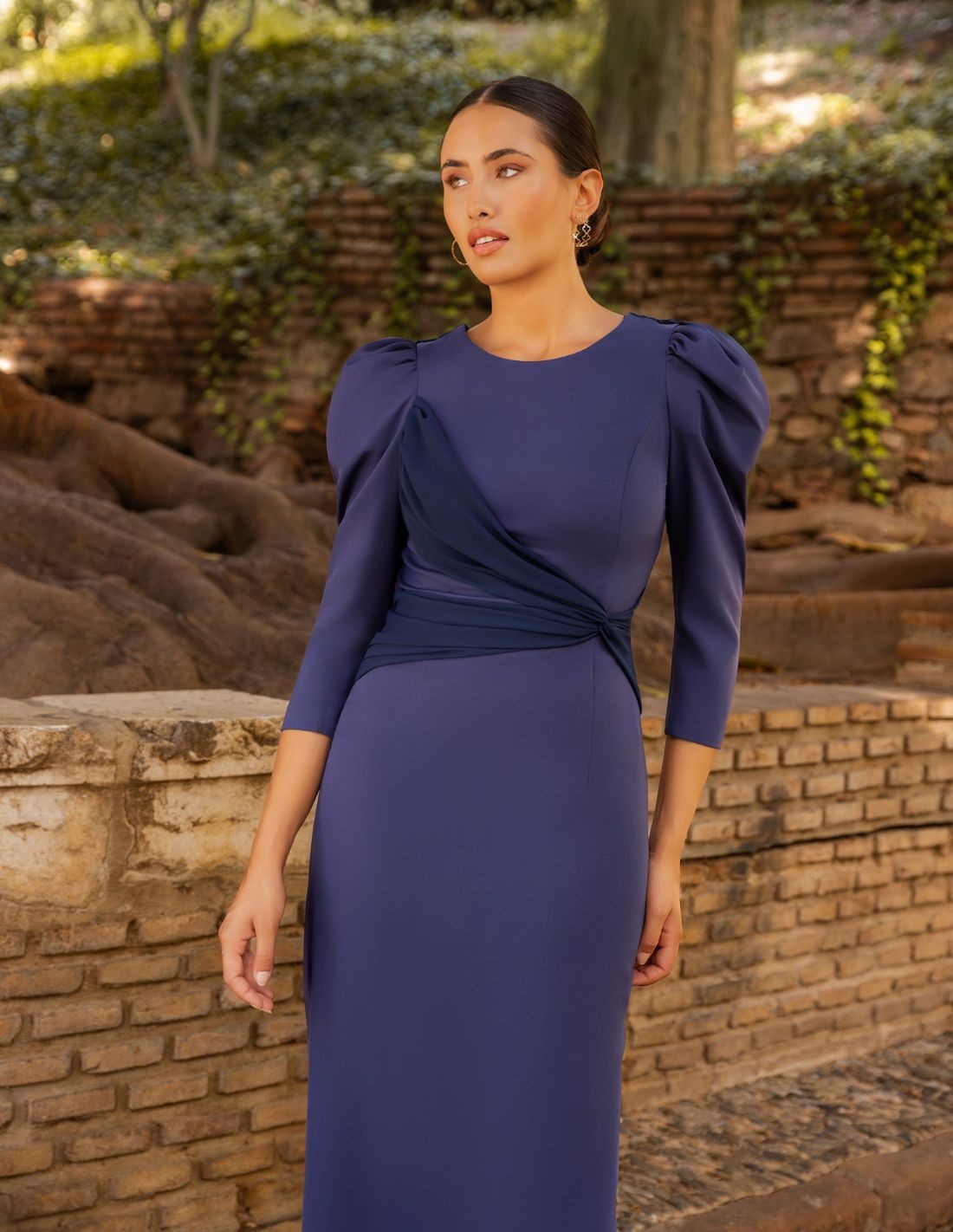 Si aún no tienes look para tu próximo evento, este vestido midi puede ser la opción ideal. Un vestido con diseño de corte midi confeccionado en tejido de creppe y gasa en color azul marino, con detalle de gasa en el cuerpo y las mangas y con la espalda descubierta añadiendo un detalle de botones joya en la parte baja de la espalda. El look ideal si quieres marcar la diferencia en un evento especial como una boda.
