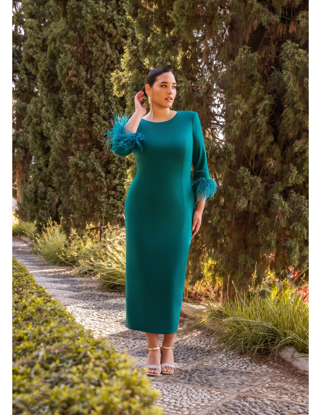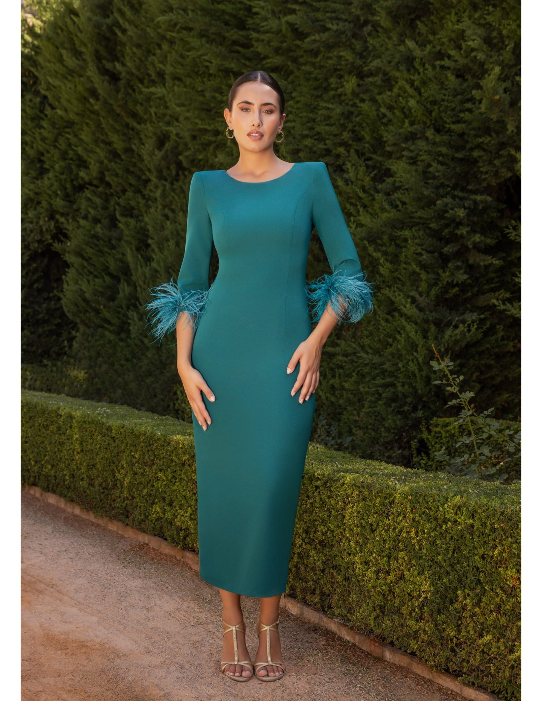 Si buscas un diseño especial para eventos de otoño/invierno, este vestido midi te hará ser una invitada perfecta. Confeccionado en crepé en color vino o turquesa con escote cerrado y manga francesa, que termina en puño de plumas. La espalda descubierta, aporta un toque súper especial y elegante al diseño, adornada además, con botones joya. Un diseño que no dejará indiferente y que será perfecto para invitada tanto de día, de tarde, como madrina.