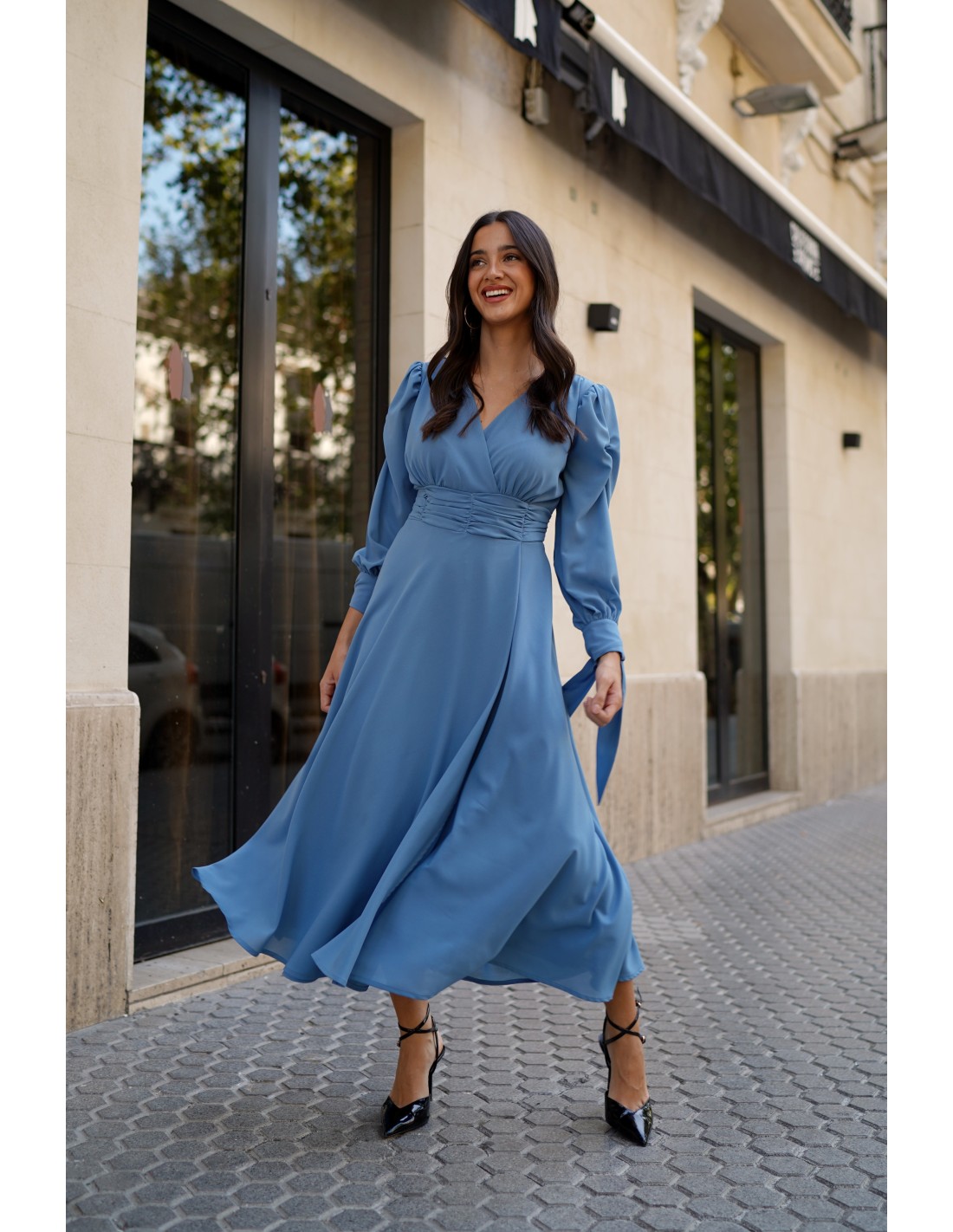 Vestido midi celeste con escote en V y mangas largas abullonadas